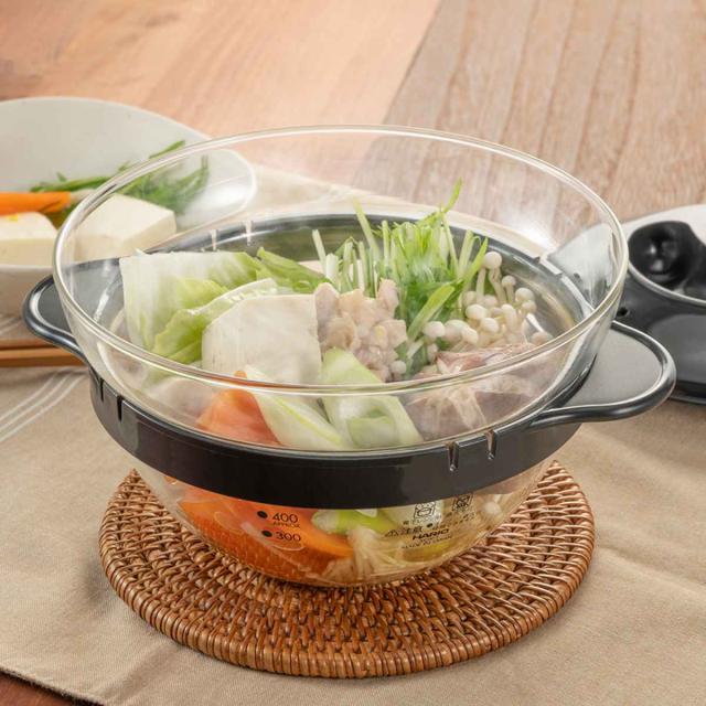 お好みの食材と調味料を入れて、レンジで加熱するだけで簡単に調理ができる、耐熱ガラス製のおかず鍋です。ひとり鍋や、カレーなどの煮込み料理、蒸し野菜など、レンジで手軽に料理が作れるので、仕事や育児に忙しいママや、ひとり暮らしの方にピッタリです。