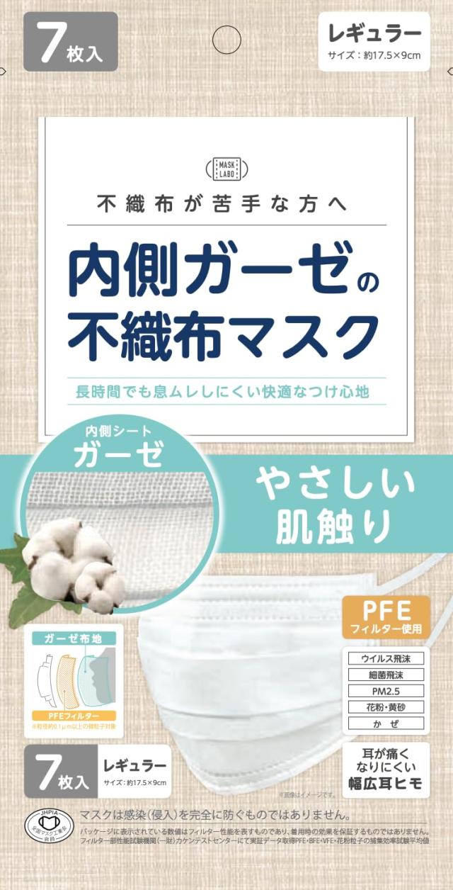 不織布が苦手な方へ!長時間でも息蒸れしにくい快適な着け心地!耳が痛くならない、ゆったりとした幅広耳ヒモPFE99%カットフィルター使用不織布3層マスクの顔に当る側がガーゼになっており肌にやさしく付け心地もやわらかです