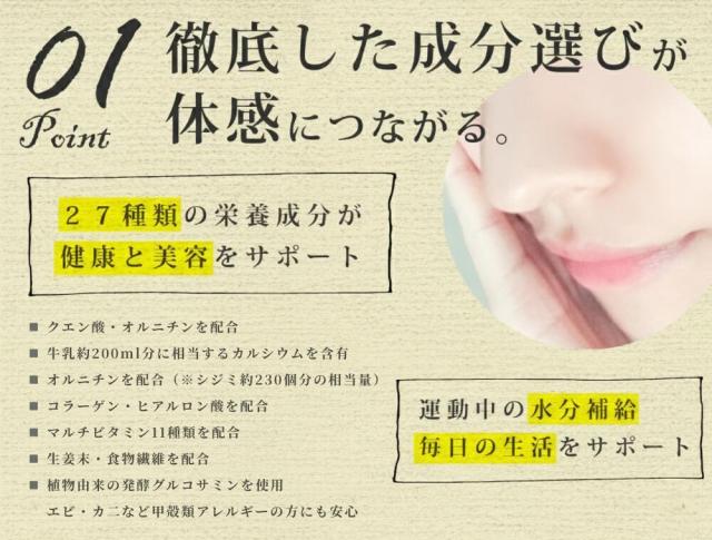 グラニュー糖(国内製造)、フィッシュコラーゲンペプチド(ゼラチン)、ぶどう糖、食塩、食物繊維、オルニチン、ショウガ末、果糖、レモン果汁、酵母(亜鉛、マンガン、銅、ヨウ素、セレン、クロム、モリブデン含有)/クエン酸、乳酸カルシウム、グルコサミン、香料、甘味料(酵素処理ステビア)、微粒二酸化ケイ素、V.C、塩化K、ナイアシン、V.E、V.B2、パントテン酸Ca、V.B1、V.B6、ヒアルロン酸、V.A、葉酸、V.B12、V.D3