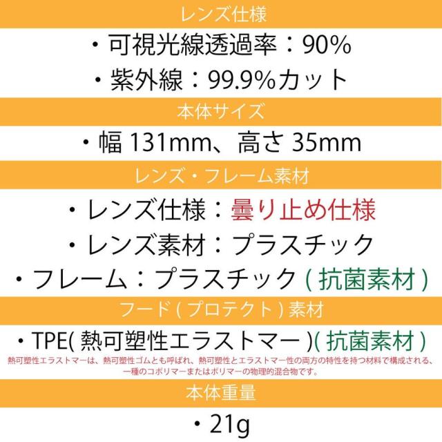 ・レンズ:プラスチック ・フレーム・テンプル:プラスチック(抗菌素材を使用) ・フード:TPE(熱可塑性エラストマー) ※ 熱可塑性エラストマーは、熱可塑性ゴムとも呼ばれ、熱可塑性とエラストマー性の両方の特性を持つ材料で構成される、一種のコポリマーまたはポリマーの物理的混合物です。 |