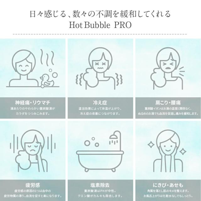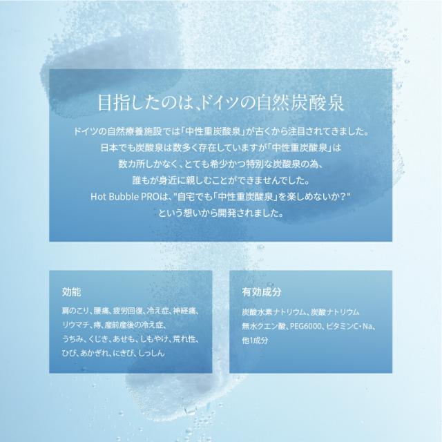 Hot Bubble PROは、ドイツで古くから利用されてきた数多くの自然炭酸湯を研究し、独自の製法によって開発した中性重炭酸入浴剤です。 お湯を中性にする事で炭酸ガスをお湯の中で重炭酸イオン に変化させている為、重炭酸イオンはタブレットが全て溶け終わった後でも、お湯の中にしっかりと溶け込みます。 タブレットから湧き出る細かな泡が全身を包み、有効成分の温浴効果により体を温めて、 肩こり、腰痛、冷え症などをじんわりとやわらげます |