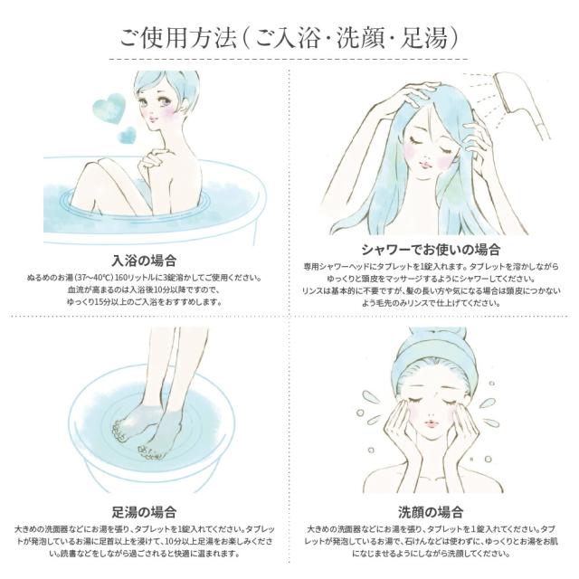 160リットルのぬるめのお湯(36〜41℃)に3錠を溶かしてご使用ください。 ゆっくり15分以上の入浴をおすすめします。 洗髪や洗顔にお使い頂いても問題ありません。 |