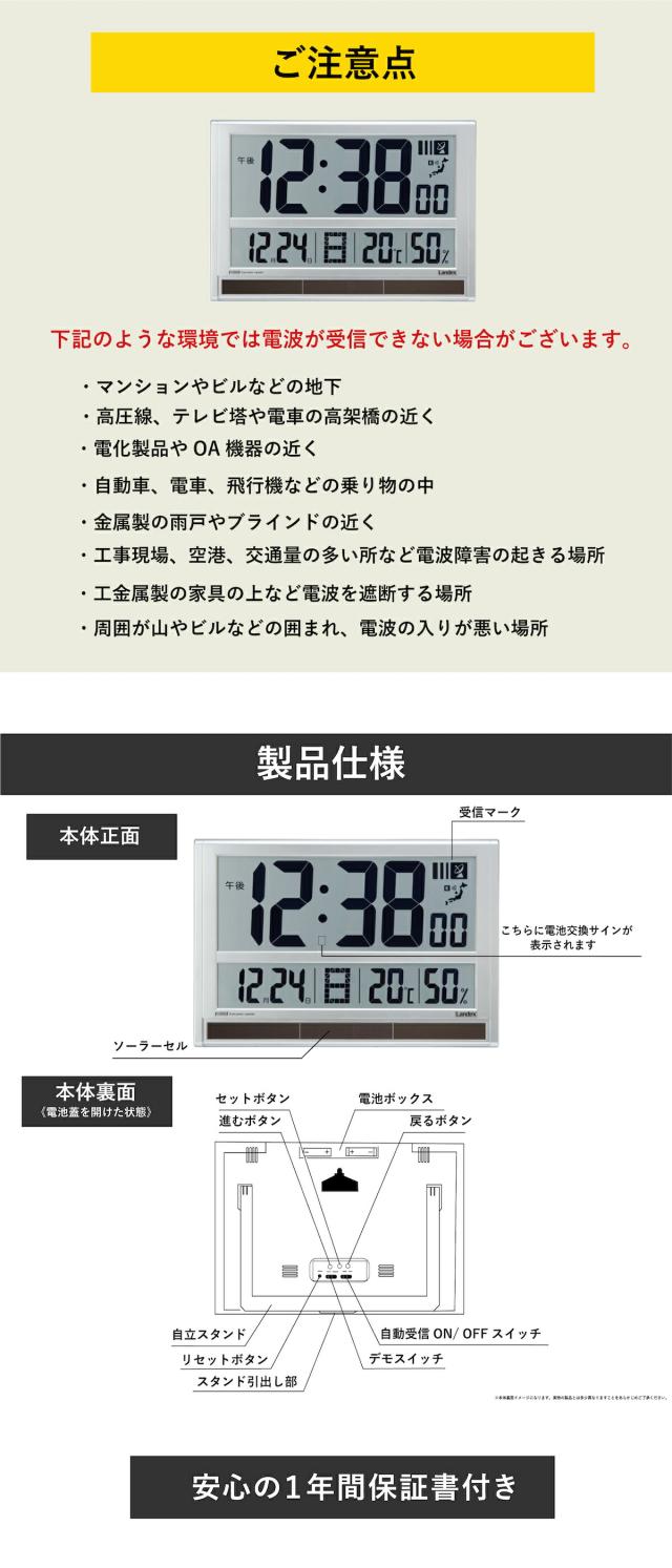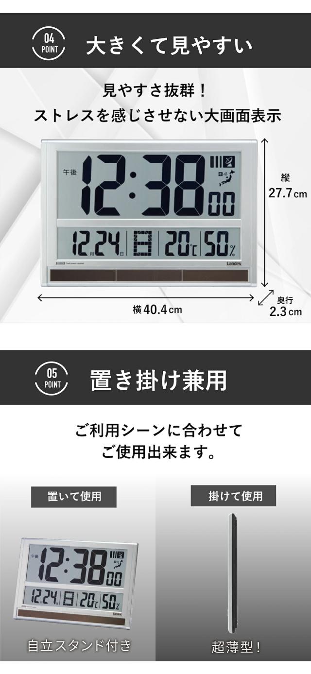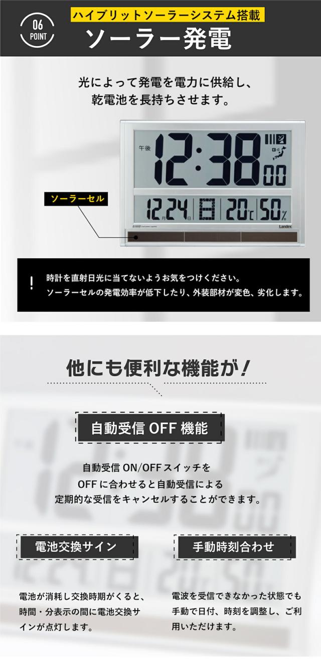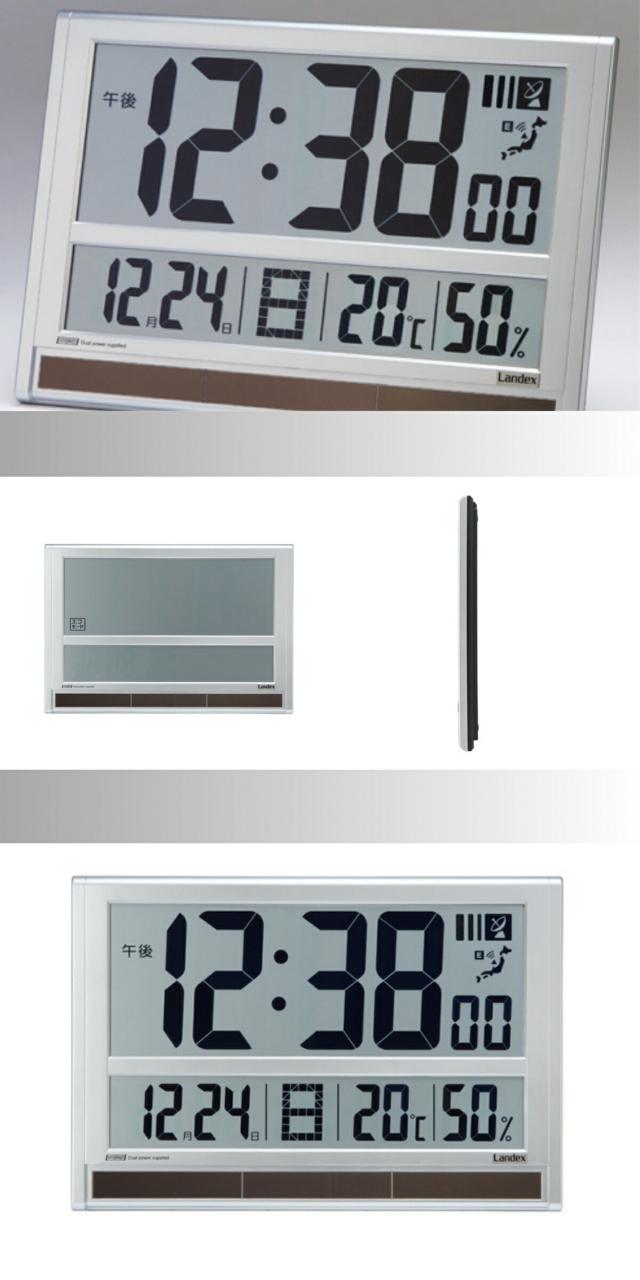 | 主な機能 | 電波時計(40kHz/60kHz)、温度計、湿度計、ハイブリッドソーラー、カレンダー、エコモードスイッチ(暗くなると表示が消えます)、受信マーク表示、受信OFF機能、大画面表示、電池交換お知らせ表示、置き掛け兼用 |