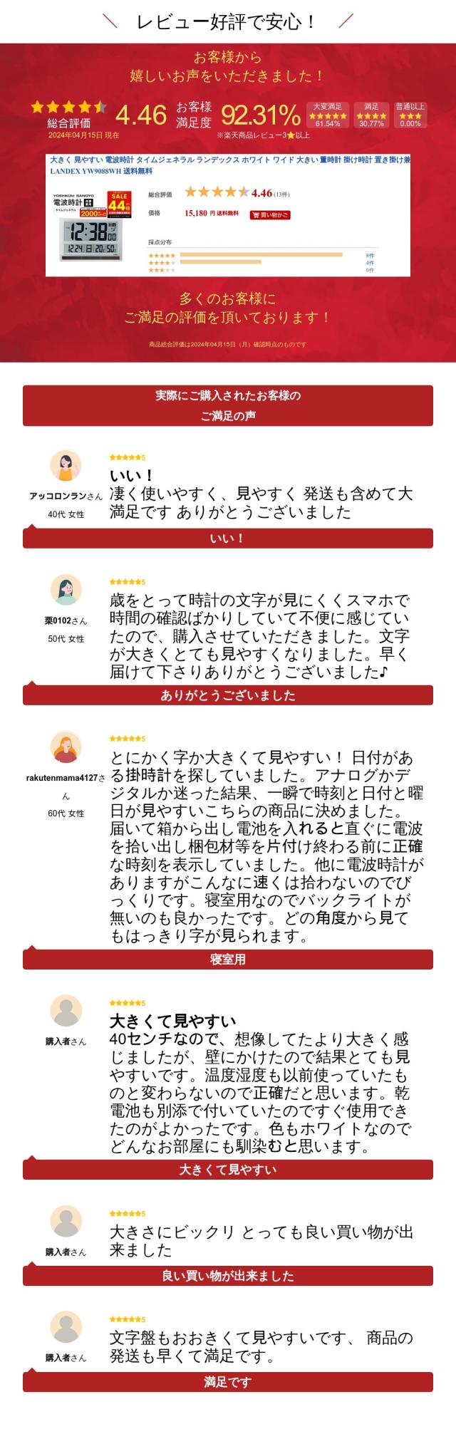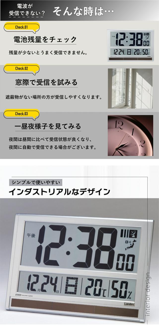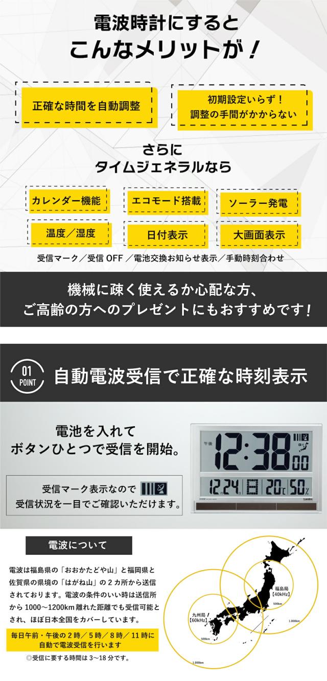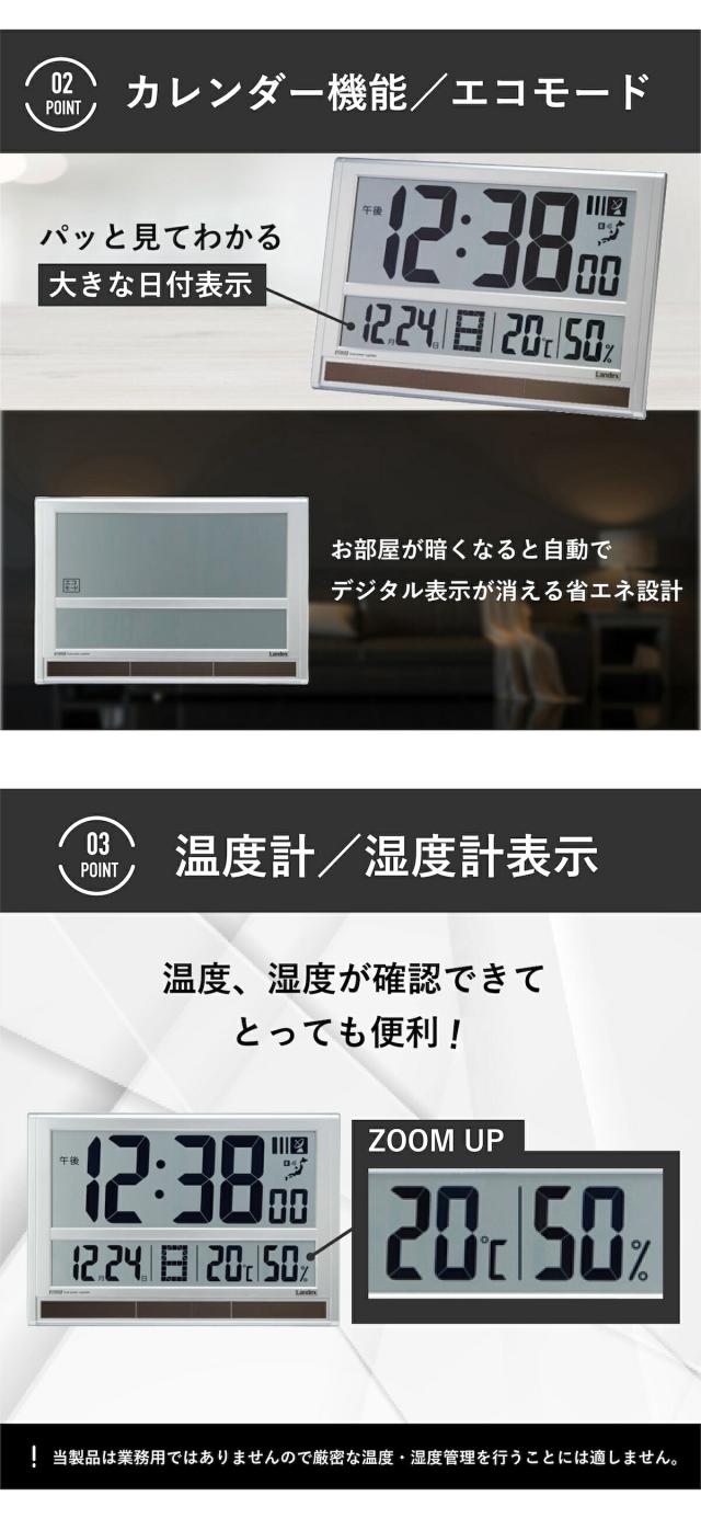 | 主な機能 | 電波時計(40kHz/60kHz)、温度計、湿度計、ハイブリッドソーラー、カレンダー、エコモードスイッチ(暗くなると表示が消えます)、受信マーク表示、受信OFF機能、大画面表示、電池交換お知らせ表示、置き掛け兼用 |