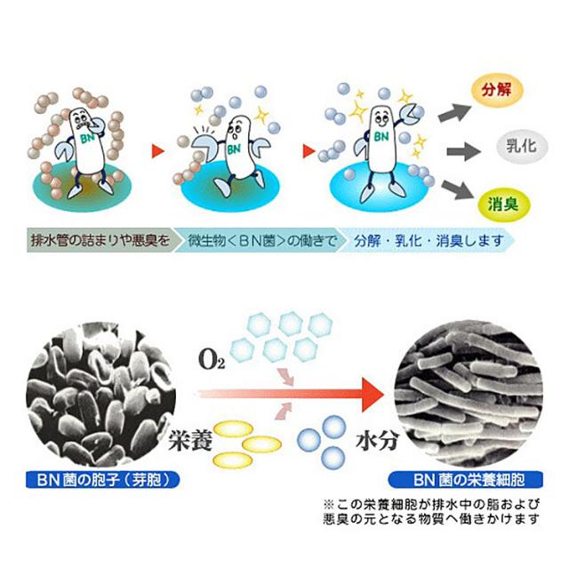 ●成分:BN菌(枯草菌)、脂肪酸ナトリウム、脂肪酸カリウム、アルコール、キレート剤 ●液性:中性 ●標準使用量:1回20ml |