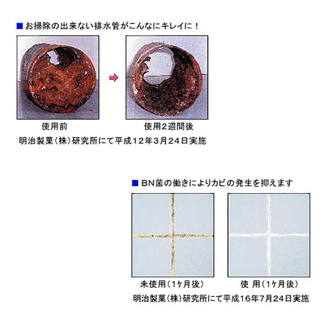 浴室、洗面台の排水管のトラブル源となる、アカ、ヌメリなどのパイプ内壁の付着物をBN菌の分泌する種々の酵素で強力分解し、除去します。