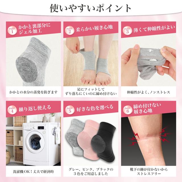 寝る時に履くだけ、かかとにジャストフィトする保湿ゲル加工が、潤いをしっかりもたらします。