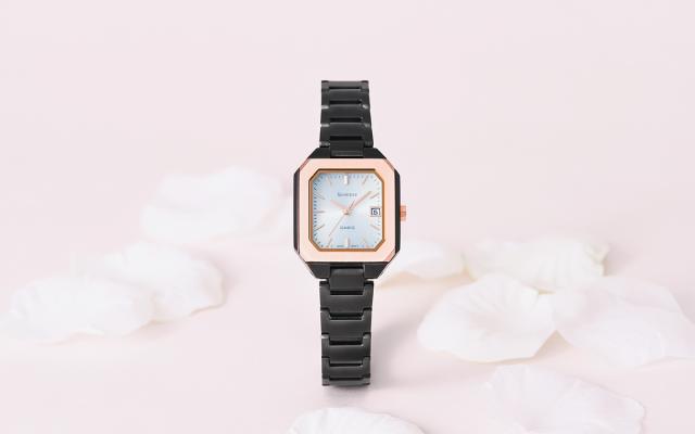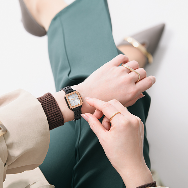ベゼルはヘアライン仕上げ、ケース側面はミラーで仕上げることでマニッシュな印象に。電池交換の手間が軽減するソーラー充電システムや日付表示機能を搭載。また、傷付きにくい高硬度の反射防止コーティングサファイアガラス、5気圧防水機能も採用しています。