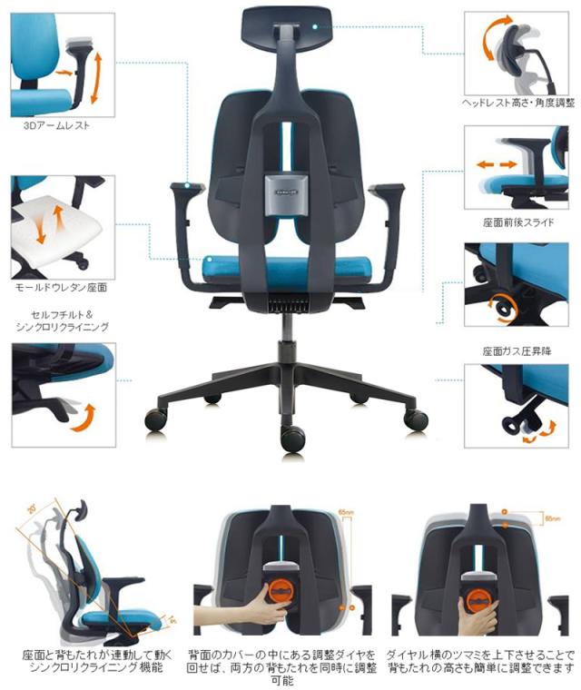 座ガス圧昇降/セルフチルト/シンクロリクライニング/アームレスト前後スライド・首振り・高さ調節/背もたれ位置調節/ヘッドレスト高さ調節/座前後スライド/ウレタン双輪キャスター