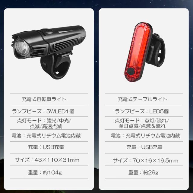 【USB充電式】: USB 充電式自転車、ヘッドライト用の内蔵 2000mAh 充電式リチウム電池、テールライト用内蔵 330mAh 充電式リチウム電池。