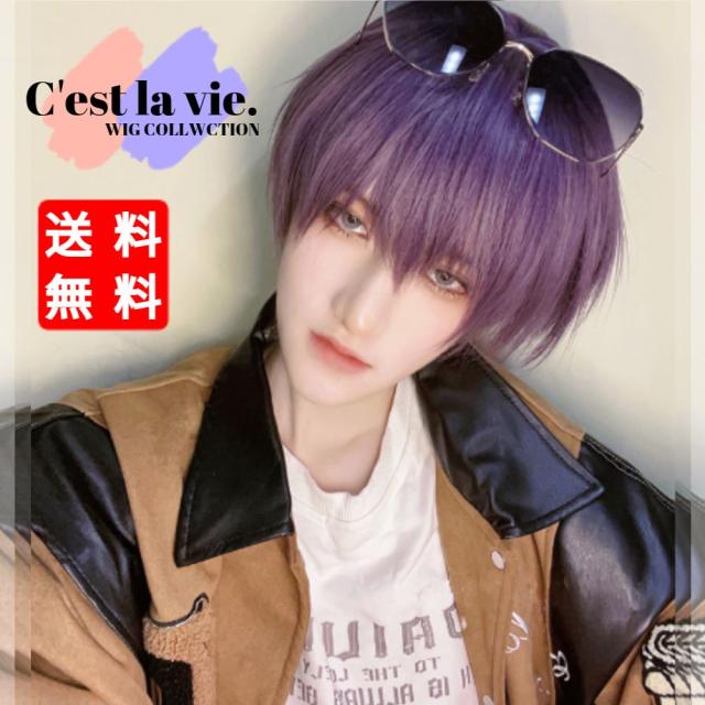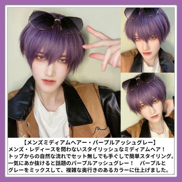 翌日出荷 フルウィッグ メンズ ミディアム パープル グレー 医療用 かつら ネット付き 自然 小顔