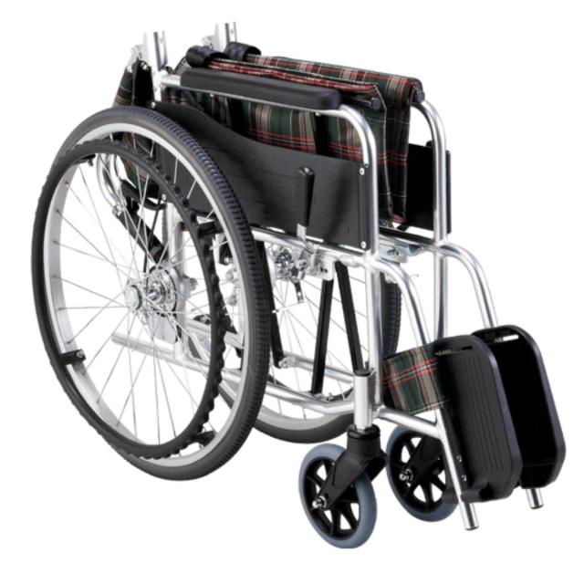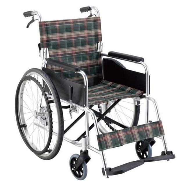 利用者様がご自分で動かすことができる、自走式タイプの車椅子です。シートカラーは無難でオシャレなチェック柄で、2色からお選びいただけます。急な坂道等や方向転換の際に安心な介助ブレーキ付きです。