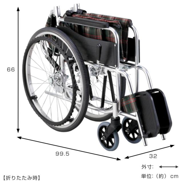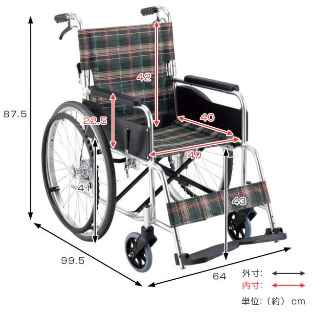 | サイズ | 約 幅64×奥行99.5×高さ87.5(cm) 折りたたみ時:約 幅32×奥行99.5×高さ66(cm) 前座高:43(cm)、後座高:41(cm) 座面幅:40(cm) 座面奥行:40(cm) バックサポート高:42(cm) アームサポート高:22.5(cm) ティッピングレバー径:22.2(mm) 前輪:6インチ、後輪22インチ |