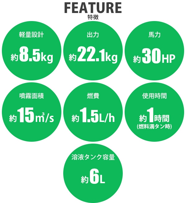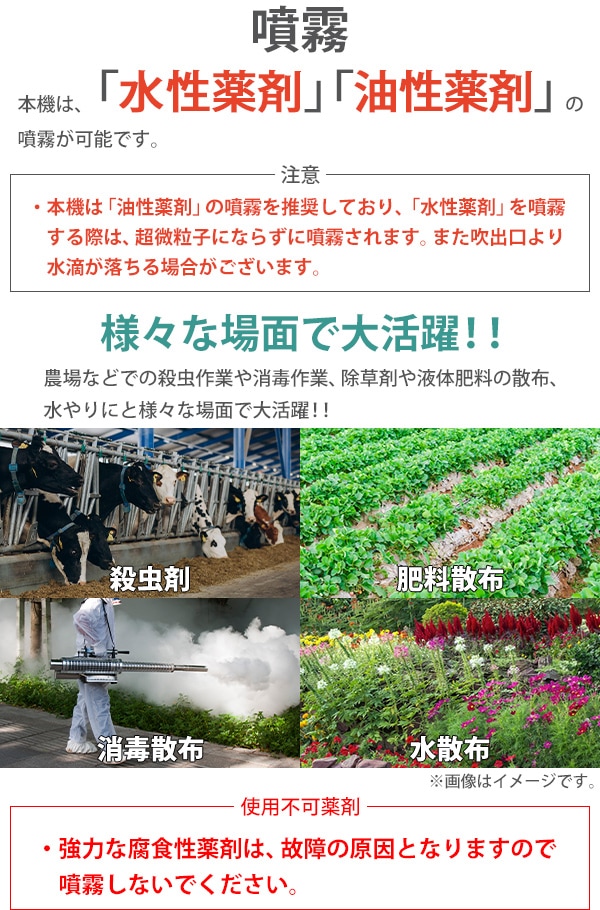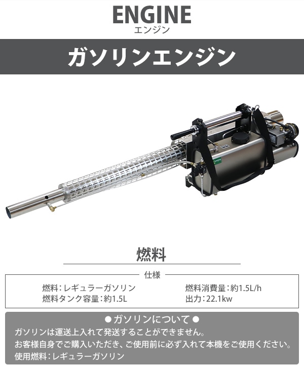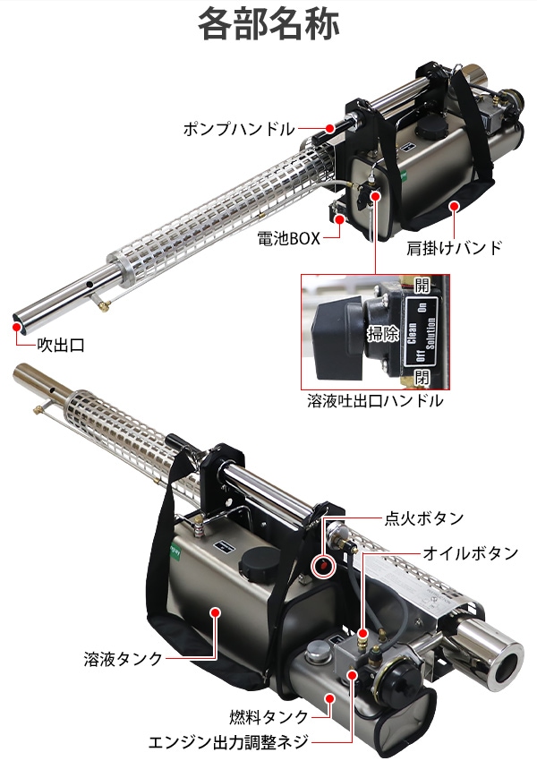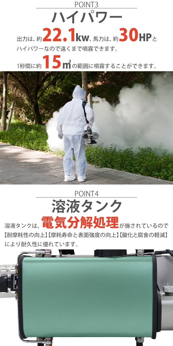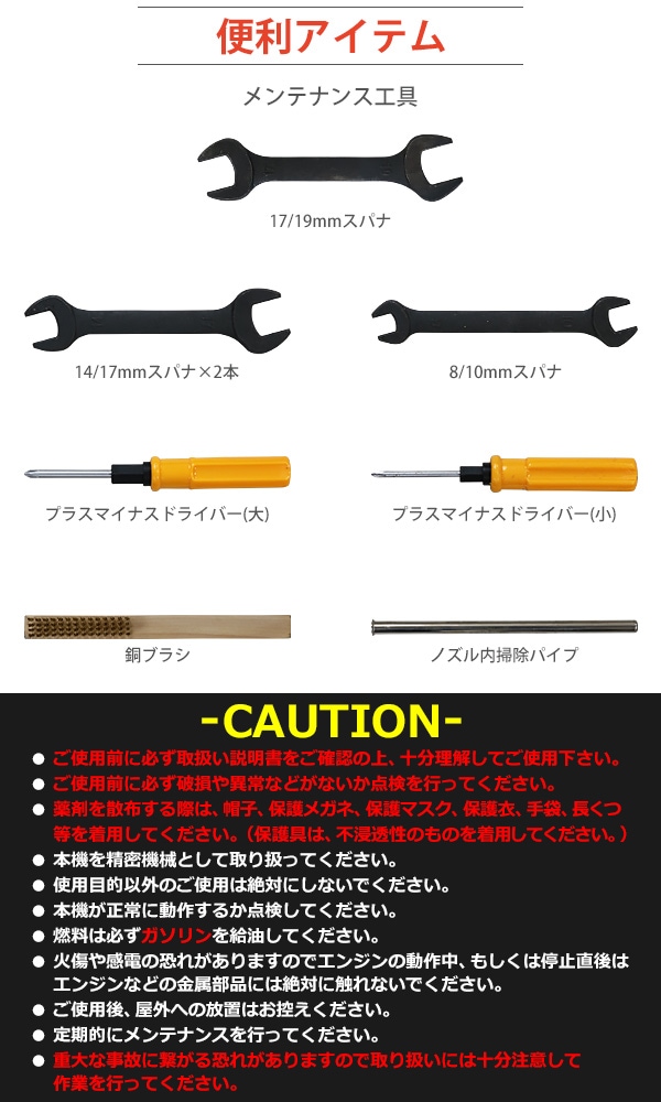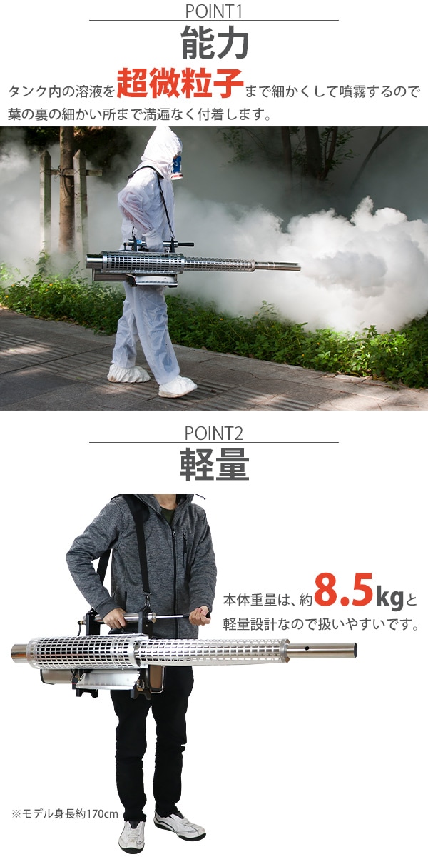 ■超微粒まで液体を細かくして噴霧するエンジン式の噴霧散布機です。 ■エンジン式なので電源がない場所でもご使用できます。 ■超微粒子噴霧なので葉の裏の細かい所まで付着するので作業効率アップ! ■消毒作業や除草剤の噴霧、殺虫剤などの散布が行えます。 ■ジョーゴには異物の混入を防ぐフィルターが付いています。 ■本体重量は約8.5kgと軽量設計なので扱いやすいです。 ■出力は、約22.1kw、馬力は約30HPとハイパワーなので1秒間に15m3の範囲に噴霧できます。 ■超微粒子まで細かくして噴霧するので吐出量は1分間に約0.25L噴出させることができます。 ■消毒作業や殺虫作業、除草剤や液体肥料の散布など様々な場面で大活躍します。 ※本機は「油性薬剤」の噴霧を推奨しており、「水性薬剤」を噴霧する際は、超微粒子にならずに噴霧されます。また吹出口より水滴が落ちる場合がございます。 ※強力な腐食性薬剤は、故障の原因となりますので噴霧しないでください。 ※こちらの商品は、完成品です。 ※溶液タンクは、電気分解処理が施されているので【耐摩耗性の向上】【磨耗寿命と表面強度の向上】【酸化、腐食の軽減】により耐久性に優れています。 ■本体重量:約8.5kg ■粒子径:20ミクロン ■吐出量:「1.0mm:15L/h」「1.2mm:20L/h」 「エンジン」 ■エンジン出力:22.1kw ■始動方法:電気始動 ■使用燃料:レギュラーガソリン ■燃料タンク容量:約1.5L ■燃料消費量:約1.5L/h ■燃料満タン時連続使用時間:約1時間 ※燃料の補充は、必ずエンジンを停止させてから行ってください。 ■騒音値:約90dB ■材質:本体(ステンレス【SUS304】、アルミ、ABS、ナイロン)、肩掛けバンド(ナイロン) ■セット内容:本体、単1電池×4、ジョーゴ×2、肩掛けバンド、耳栓、スペアパーツ、メンテナンス工具、日本語説明書 ●新品商品ではありますが、輸入商品の為、多少の擦り傷などがある場合がございますので、ご納得の上ご購入下さいませ。 ●ご購入後、お客様ご都合によるご返品、ご返金等は一切お受け致しておりません。 ●本商品を使用した際に発生したトラブル、事故につきまして、当社は一切の責任を負いません。ご使用に関しましては、全て自己責任にてお願い致します。 ●ご使用前に、必ず取扱い説明書をご確認の上、十分理解して本機をご使用下さい。 |