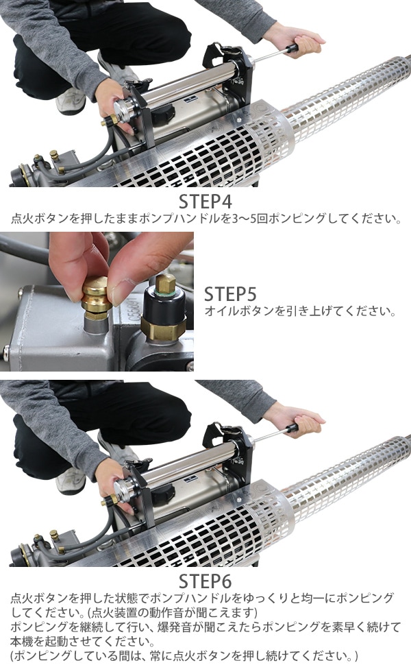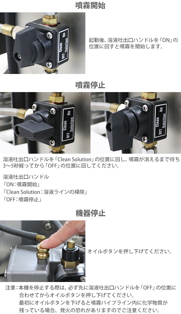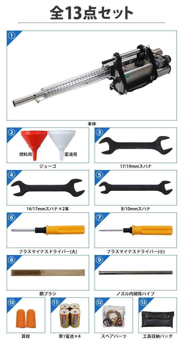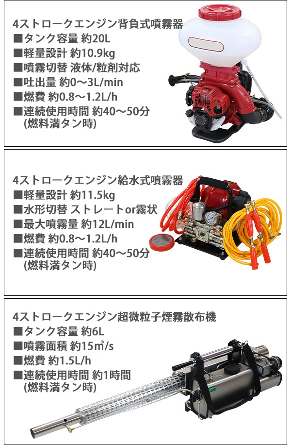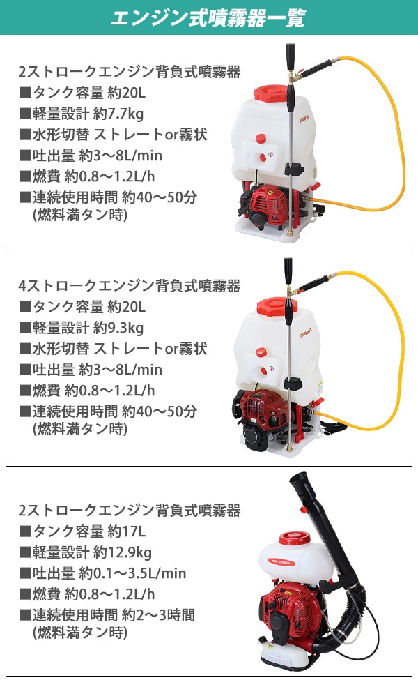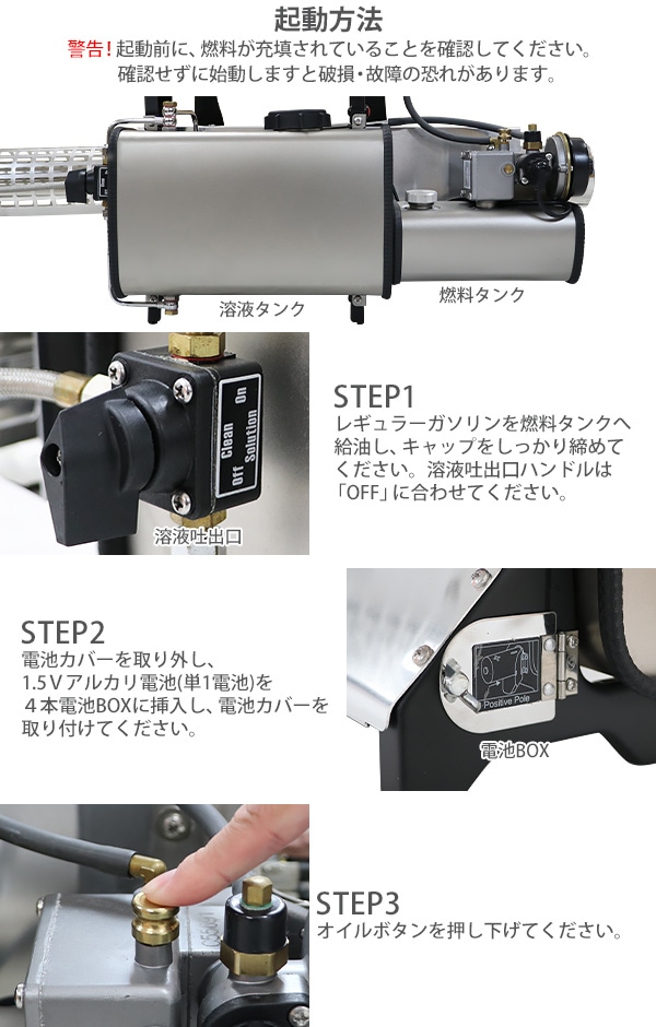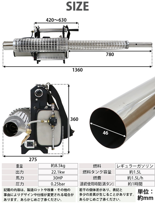 ■超微粒まで液体を細かくして噴霧するエンジン式の噴霧散布機です。 ■エンジン式なので電源がない場所でもご使用できます。 ■超微粒子噴霧なので葉の裏の細かい所まで付着するので作業効率アップ! ■消毒作業や除草剤の噴霧、殺虫剤などの散布が行えます。 ■ジョーゴには異物の混入を防ぐフィルターが付いています。 ■本体重量は約8.5kgと軽量設計なので扱いやすいです。 ■出力は、約22.1kw、馬力は約30HPとハイパワーなので1秒間に15m3の範囲に噴霧できます。 ■超微粒子まで細かくして噴霧するので吐出量は1分間に約0.25L噴出させることができます。 ■消毒作業や殺虫作業、除草剤や液体肥料の散布など様々な場面で大活躍します。 ※本機は「油性薬剤」の噴霧を推奨しており、「水性薬剤」を噴霧する際は、超微粒子にならずに噴霧されます。また吹出口より水滴が落ちる場合がございます。 ※強力な腐食性薬剤は、故障の原因となりますので噴霧しないでください。 ※こちらの商品は、完成品です。 ※溶液タンクは、電気分解処理が施されているので【耐摩耗性の向上】【磨耗寿命と表面強度の向上】【酸化、腐食の軽減】により耐久性に優れています。 ■本体重量:約8.5kg ■粒子径:20ミクロン ■吐出量:「1.0mm:15L/h」「1.2mm:20L/h」 「エンジン」 ■エンジン出力:22.1kw ■始動方法:電気始動 ■使用燃料:レギュラーガソリン ■燃料タンク容量:約1.5L ■燃料消費量:約1.5L/h ■燃料満タン時連続使用時間:約1時間 ※燃料の補充は、必ずエンジンを停止させてから行ってください。 ■騒音値:約90dB ■材質:本体(ステンレス【SUS304】、アルミ、ABS、ナイロン)、肩掛けバンド(ナイロン) ■セット内容:本体、単1電池×4、ジョーゴ×2、肩掛けバンド、耳栓、スペアパーツ、メンテナンス工具、日本語説明書 ●新品商品ではありますが、輸入商品の為、多少の擦り傷などがある場合がございますので、ご納得の上ご購入下さいませ。 ●ご購入後、お客様ご都合によるご返品、ご返金等は一切お受け致しておりません。 ●本商品を使用した際に発生したトラブル、事故につきまして、当社は一切の責任を負いません。ご使用に関しましては、全て自己責任にてお願い致します。 ●ご使用前に、必ず取扱い説明書をご確認の上、十分理解して本機をご使用下さい。 |