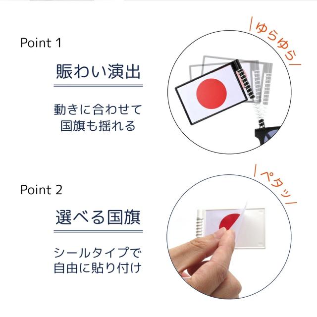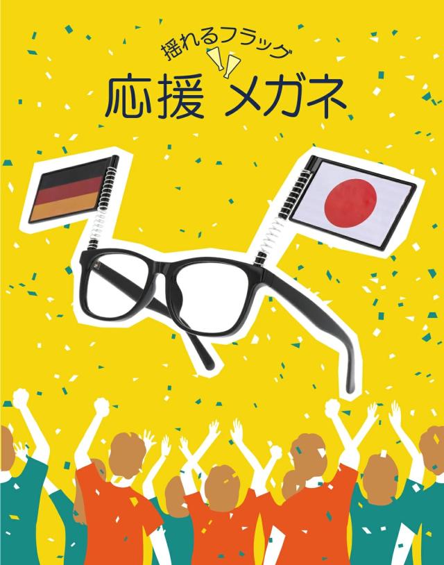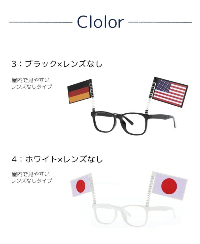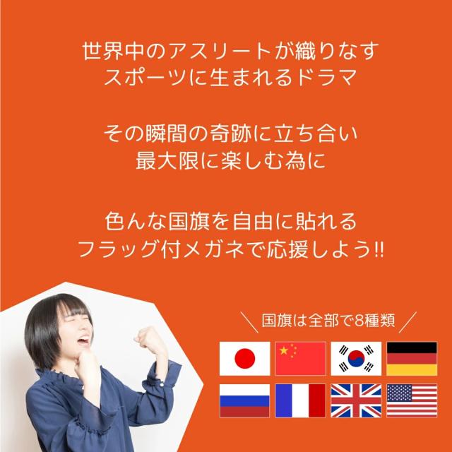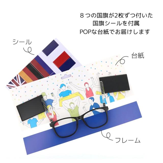 スポーツ観戦を盛り上げる、揺れるフラッグ付の応援メガネ。8種類の国旗シールを自由に貼り付ける事ができ、サンズラスレンズとレンズなしの2モデル、ホワイトとブラックの2色展開。男性女性、誰もが似合うウェリントンデザインです。