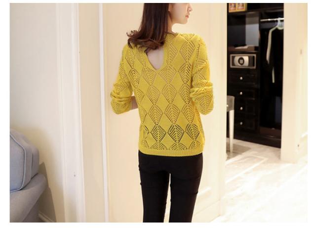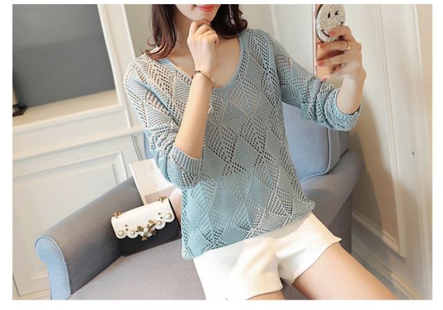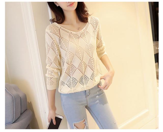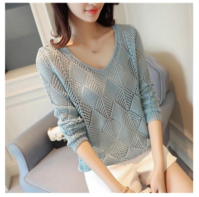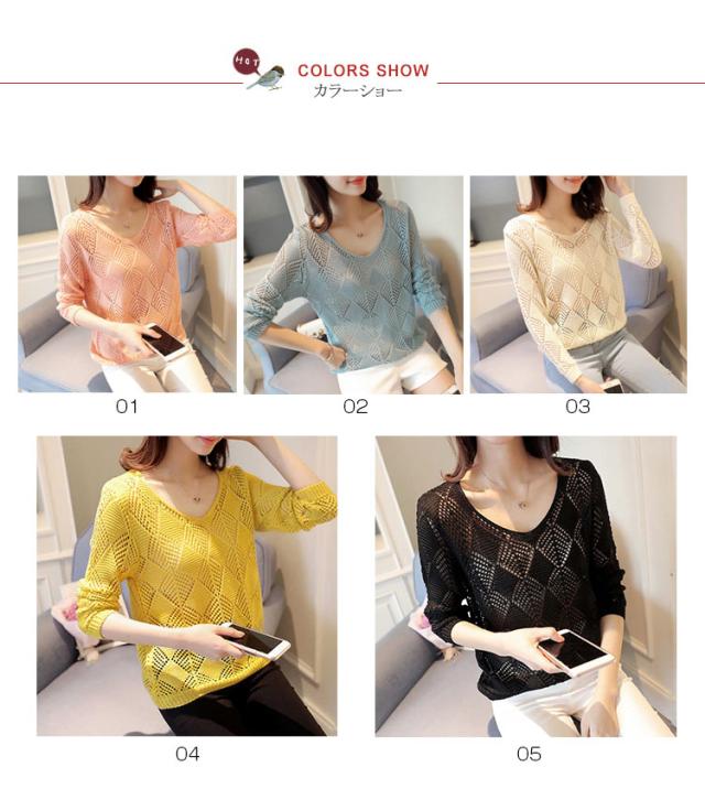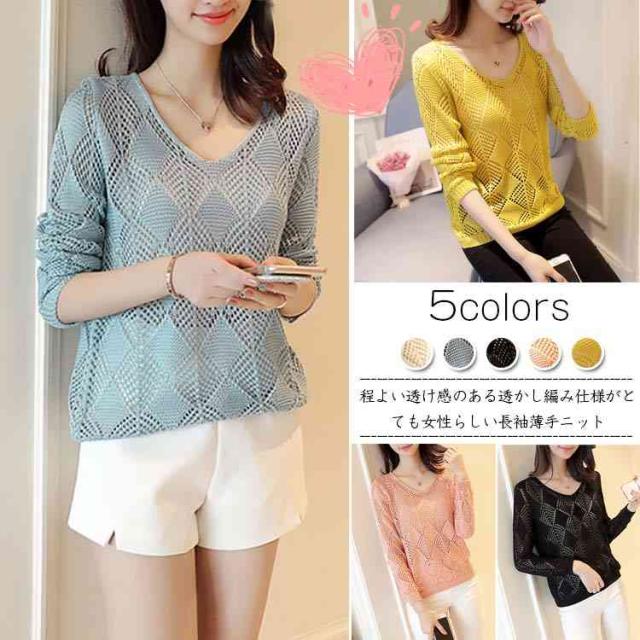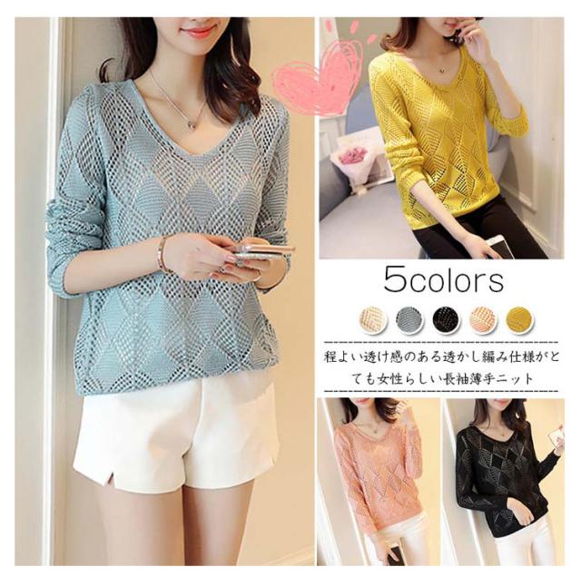 ざっくりニット 春秋 薄手 透かし編みニット Vネック プルオーバー 長袖