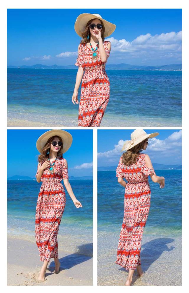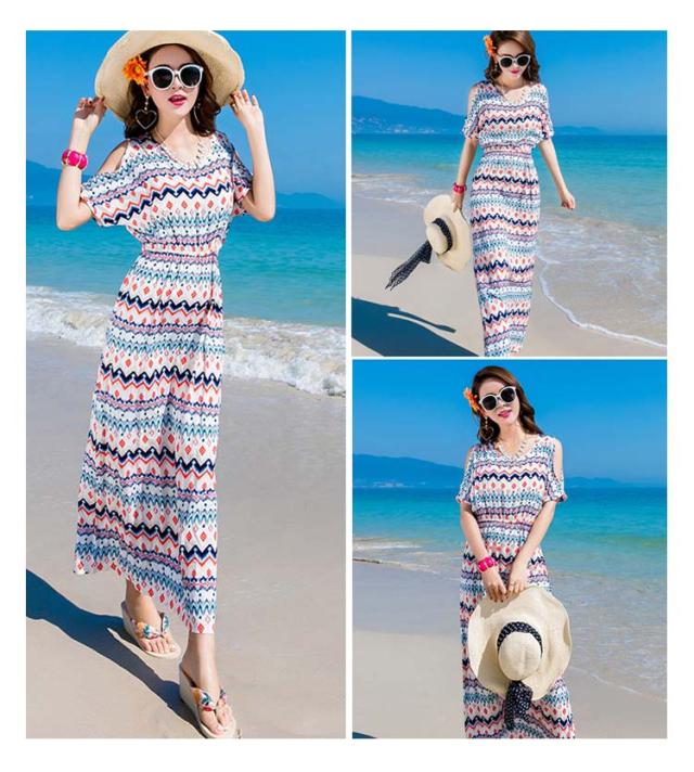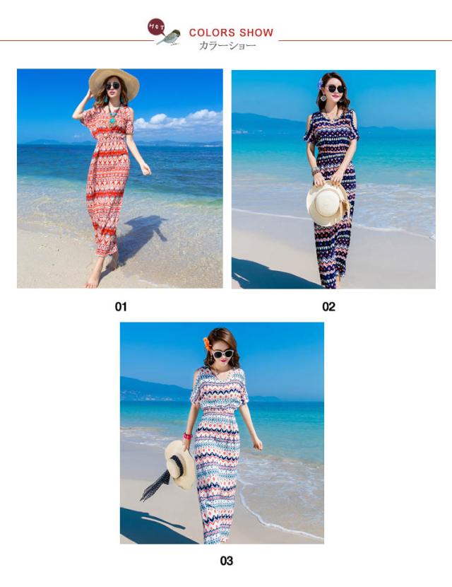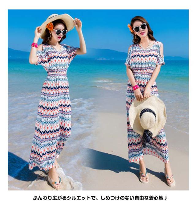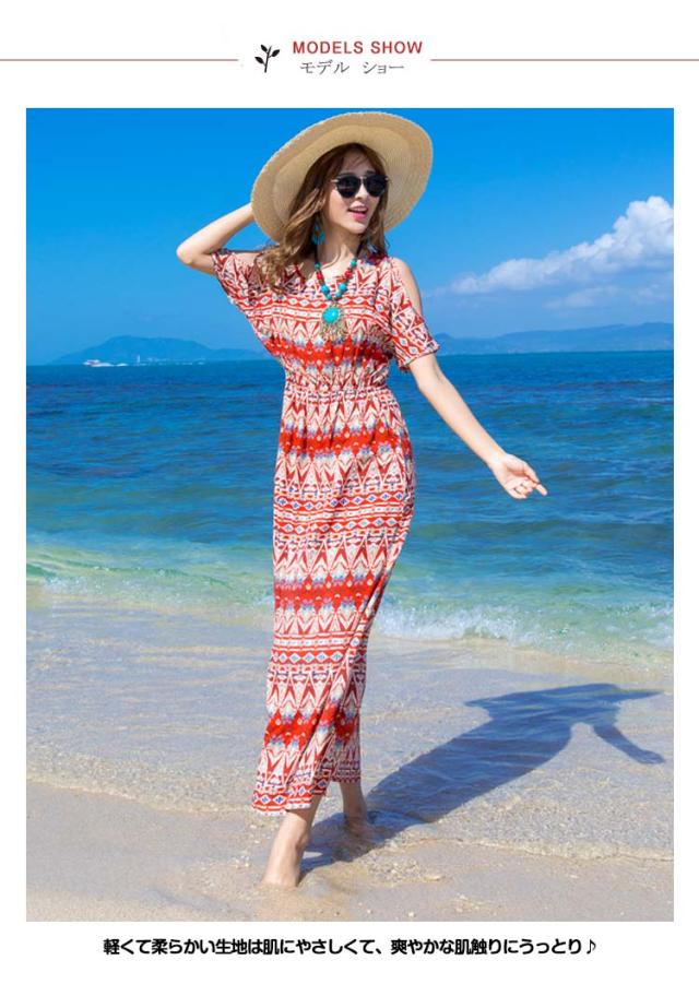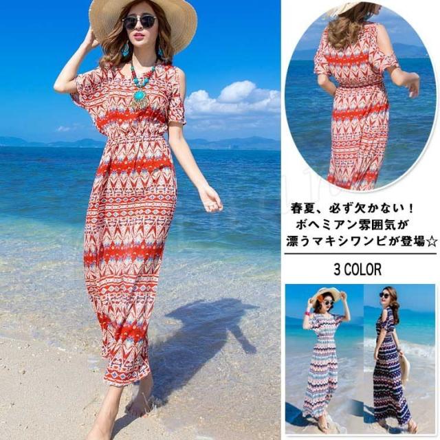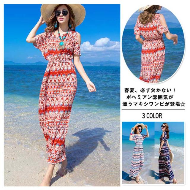 ボヘミアンワンピース 民族風ワンピース マキシワンピース オフショルダーワンピース エスニック風ワンピ ハイウエスト リゾートワンピ ビーチ