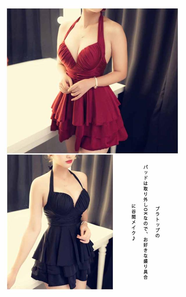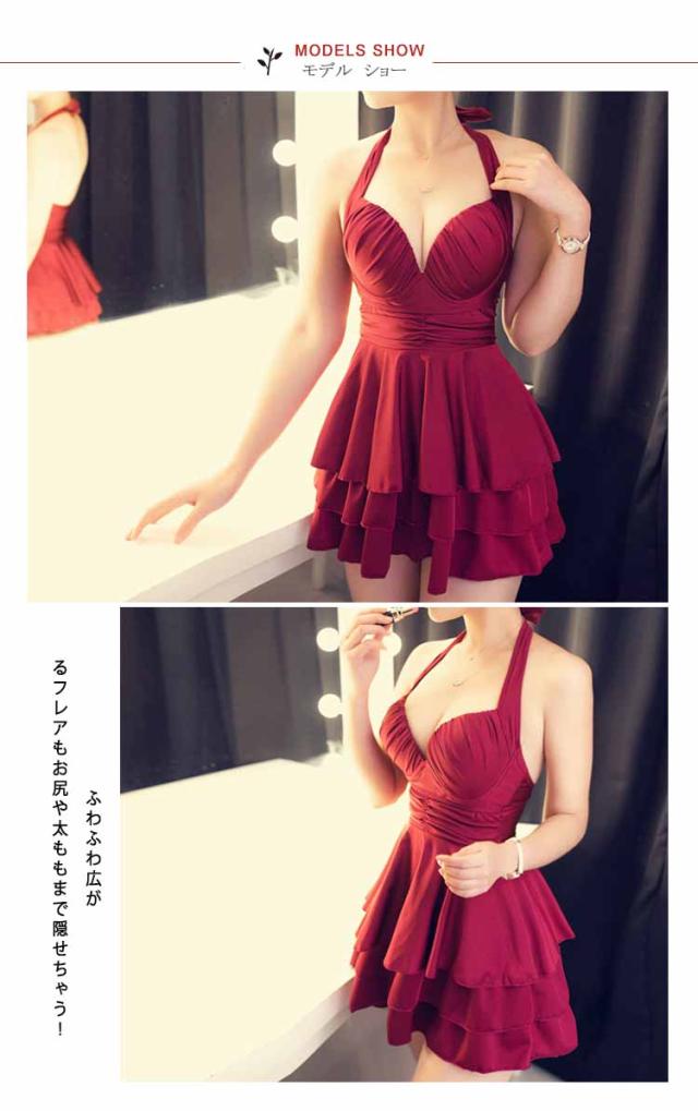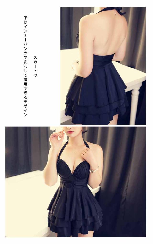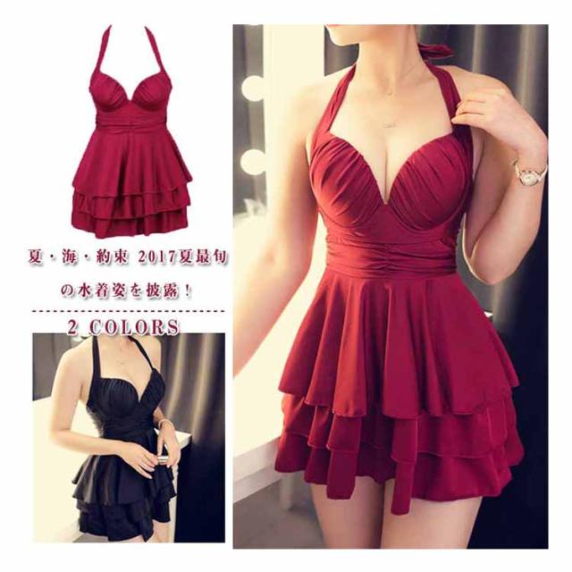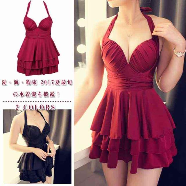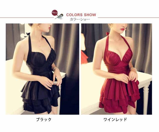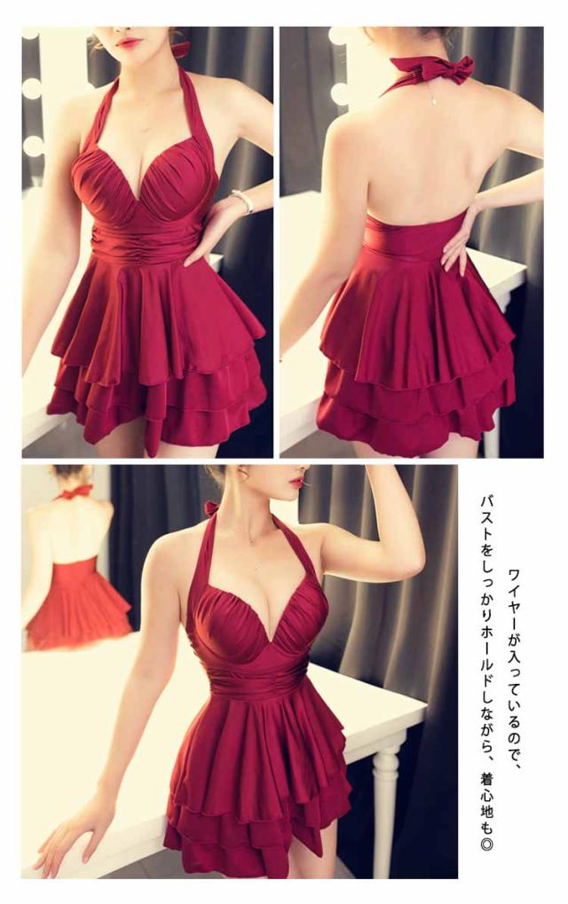 ワンピース水着 ホルターネック水着 レディース フレアワンピース水着 2点セット ボクサーパンツ付き パッド付き水着 ワイヤー水着