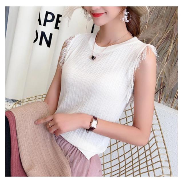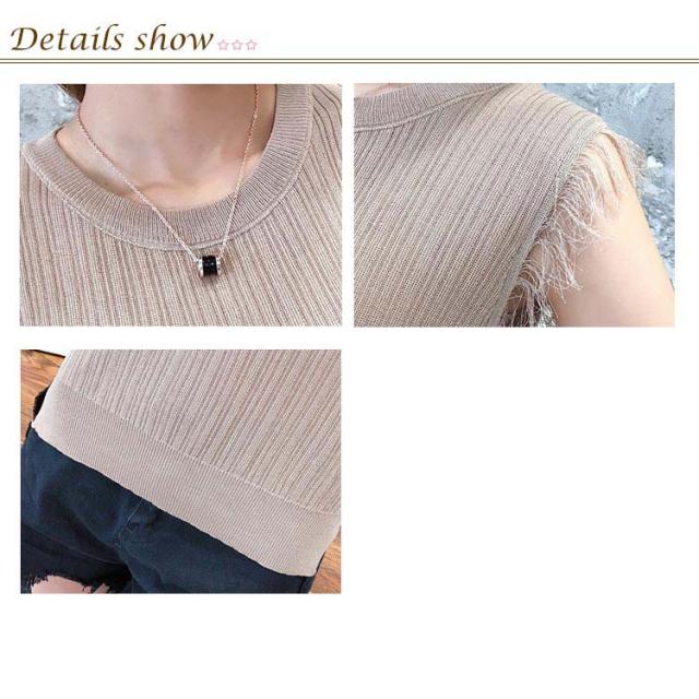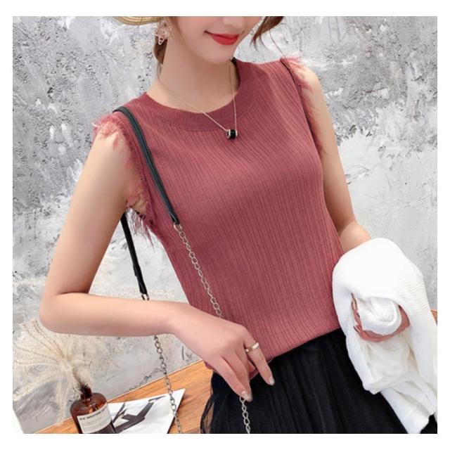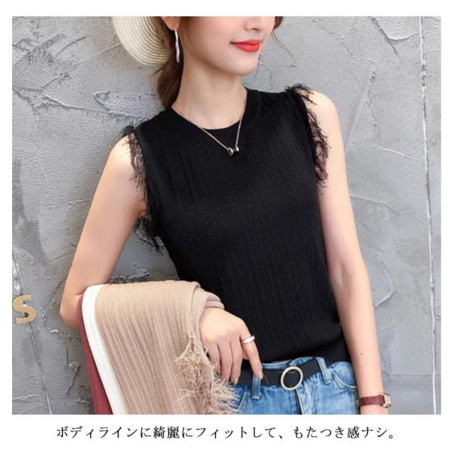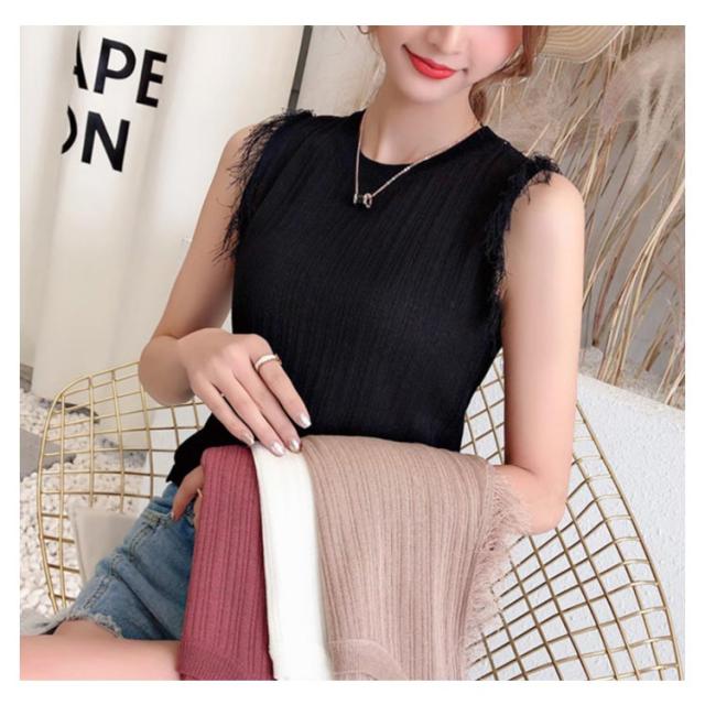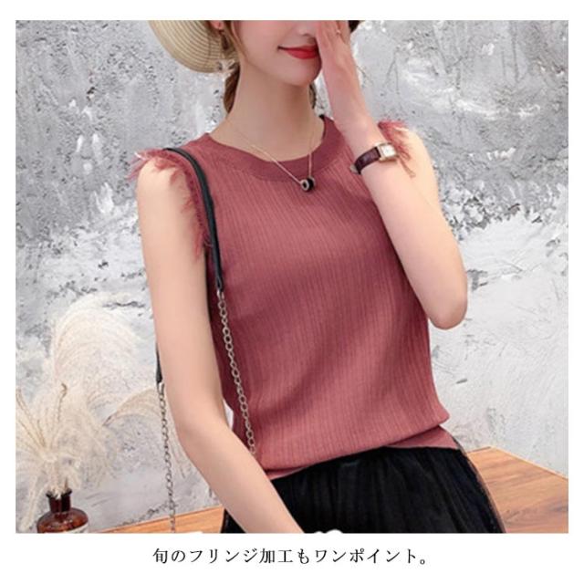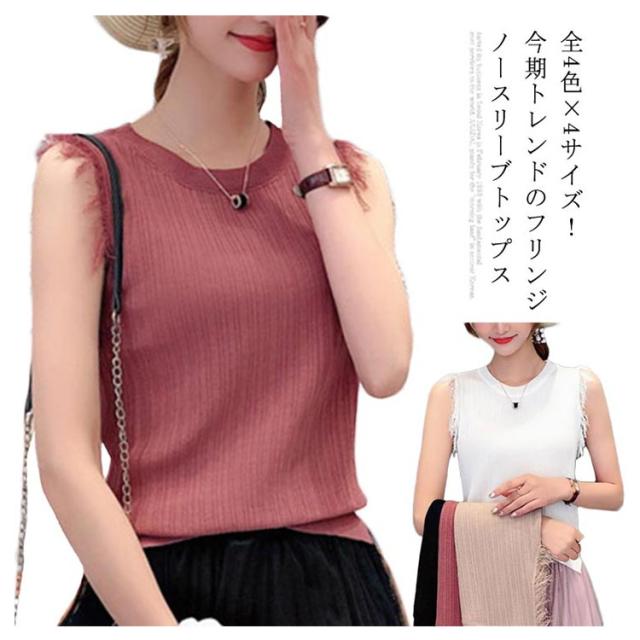 全4色×4サイズ!フリンジノースリーブトップス サマーニット レディース ニット ノースリーブ ニットトップス ラウンドネック シンプル 無地 おしゃれ 夏