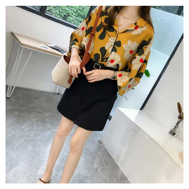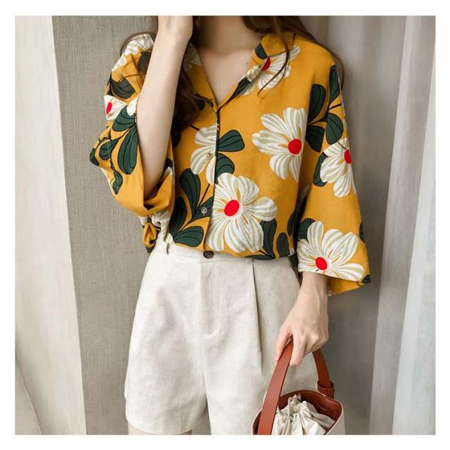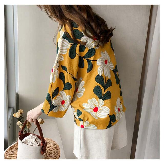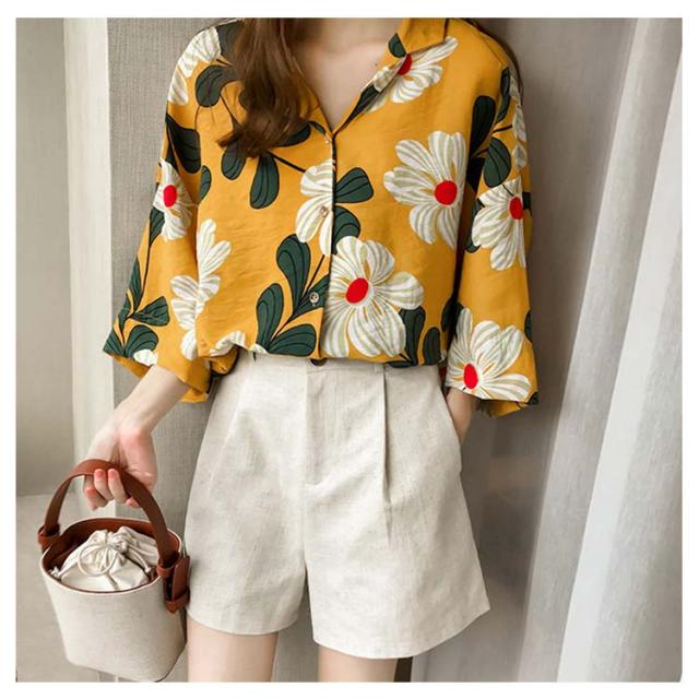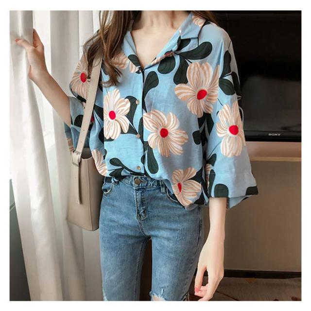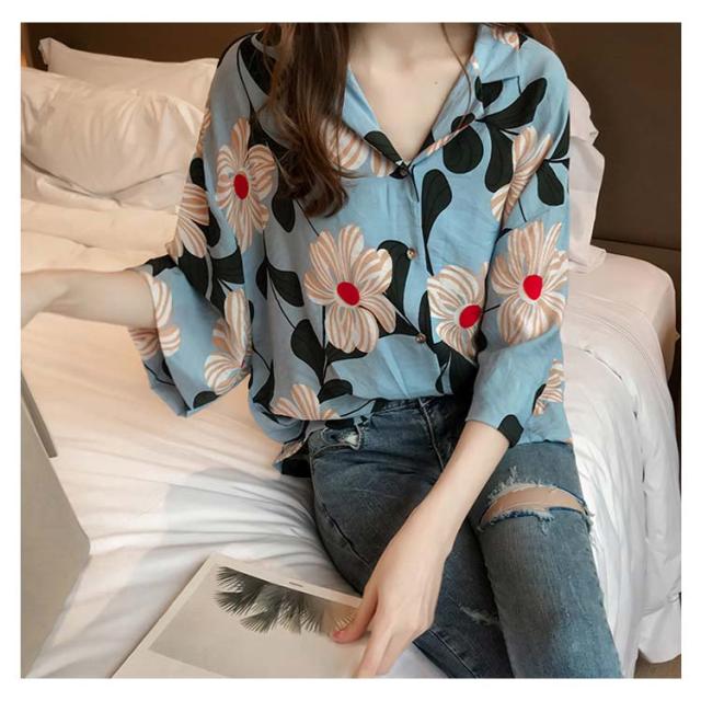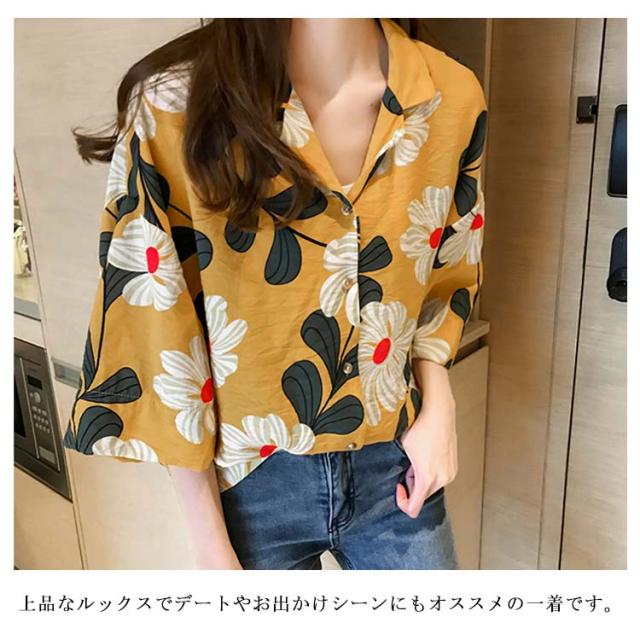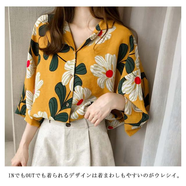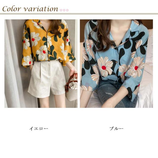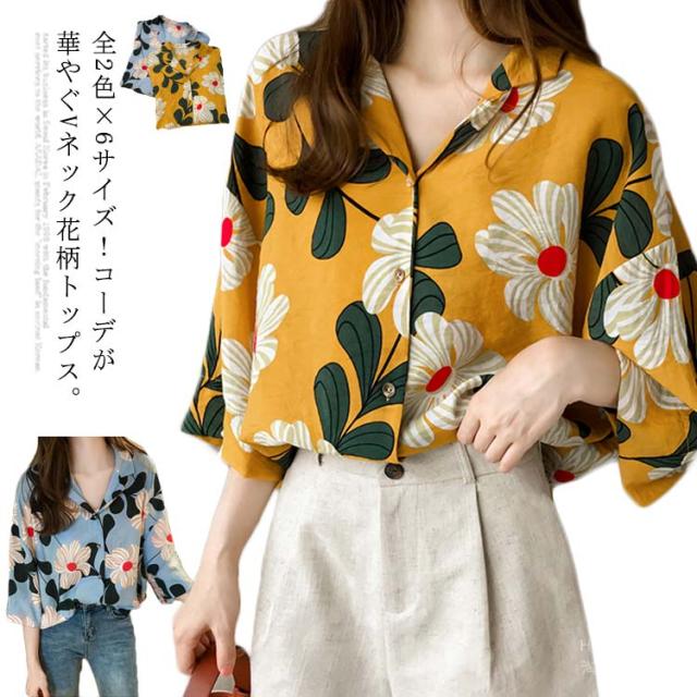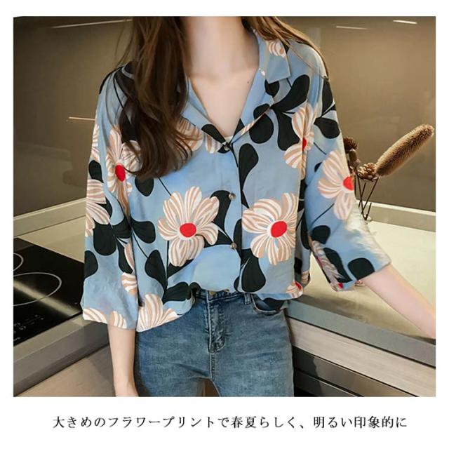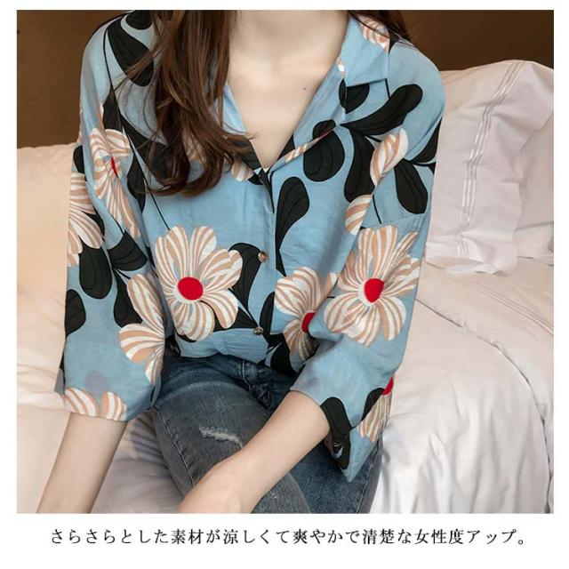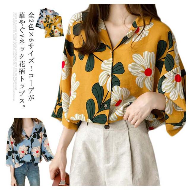 全2色×6サイズ!花柄シャツ レディース 花柄 7分袖シャツ 七分袖 カジュアルシャツ 夏シャツ 日焼け防止 Vネック シャツ ブラウス トップス フラワー おしゃれ 可愛い 大きサイズ