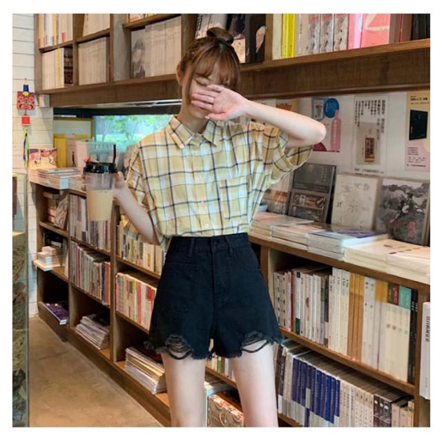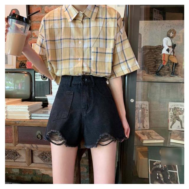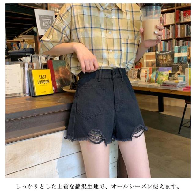 ハイウエストショートパンツ デニムショートパンツ クラッシュ加工 ショートパンツ ハイウエスト 美脚 短パン aライン ボトムス ブラック 春夏
