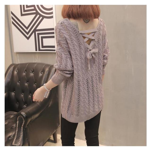 全5色!バックレース編み上げニットソー ロングニット シースルーニット 透け編み ニットトップス ロング Vネック プルオーバー シンプル 無地 春 夏 秋