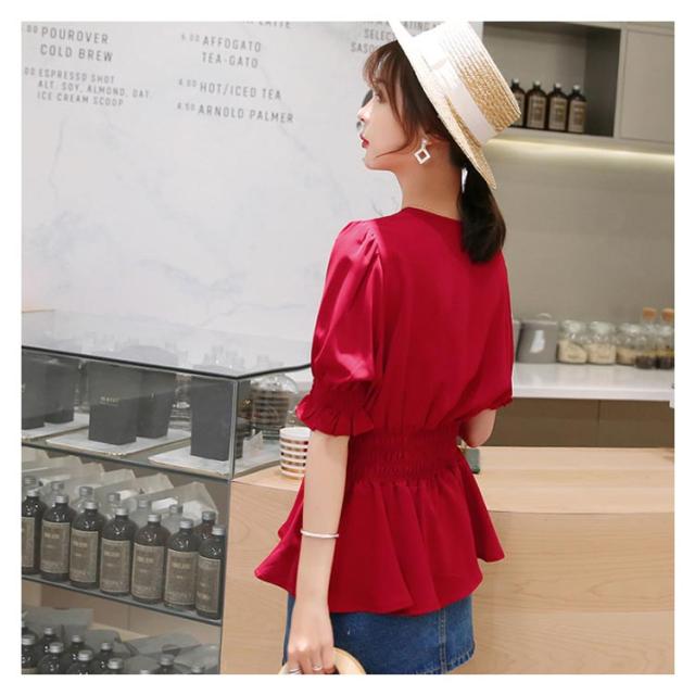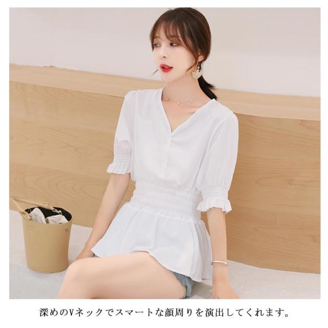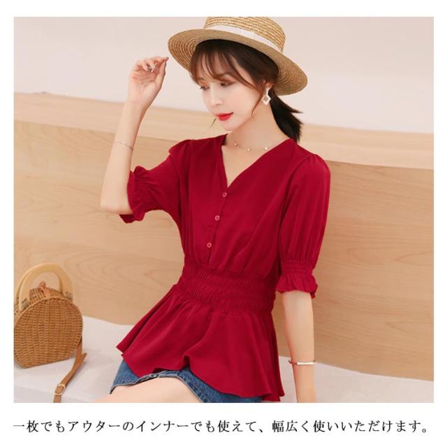 ウエストシャーリングブラウス レディース カジュアルシャツ シャツ ブラウス aライン 5分袖 Vネック シンプル 可愛い 無地 春 夏 秋