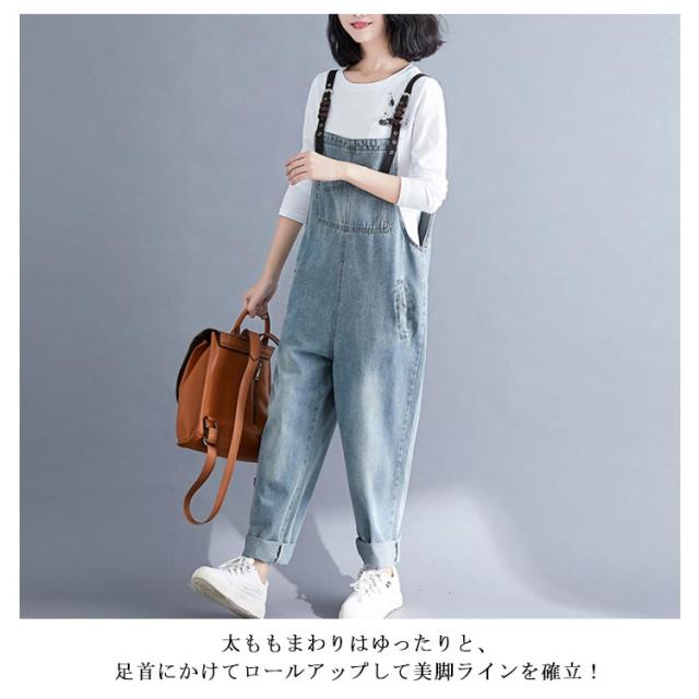 デニムサロペット オーバーオール レディース オールインワン サロペット ロールアップ ロング丈 デニムパンツ デニム ボトムス サロペットパンツ サルエル ゆったり カジュアル
