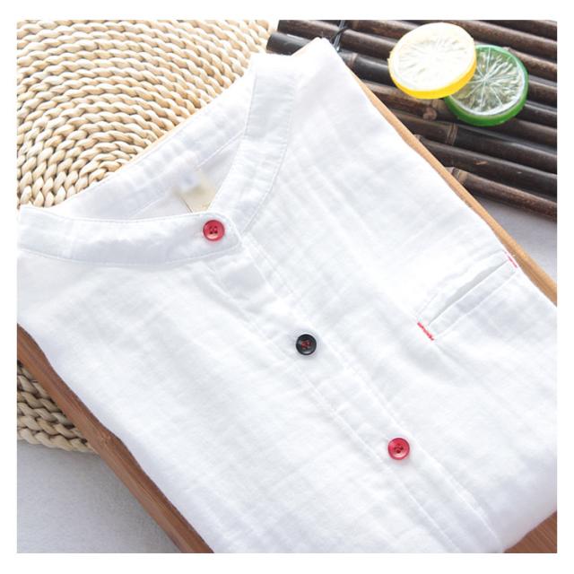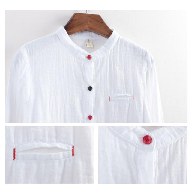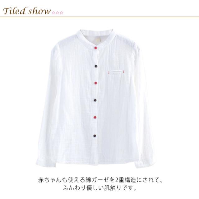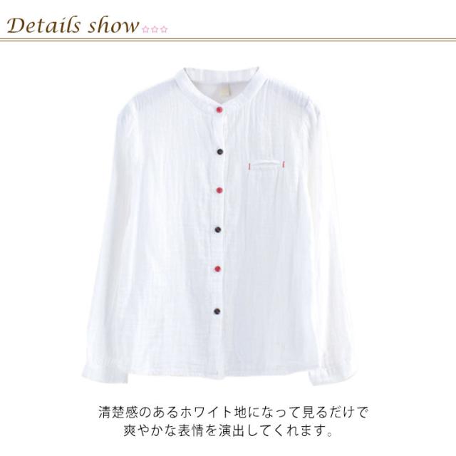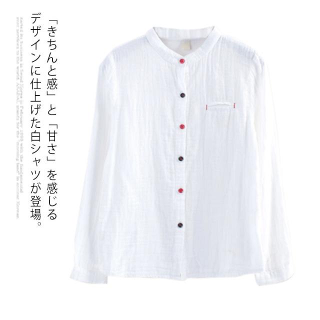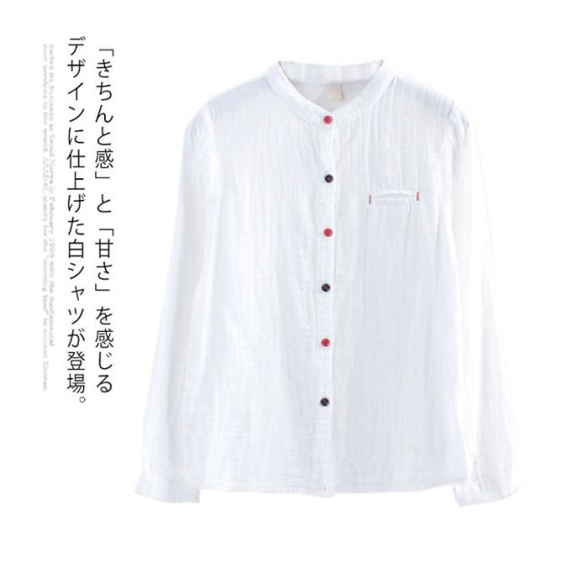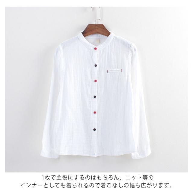 コットンガーゼ シャツ 長袖 白シャツ レディース コットンシャツ トップス ブラウス 前開き 立ち襟 ノーカラー シンプル 可愛い 綿 コットン 春 夏 秋 冬