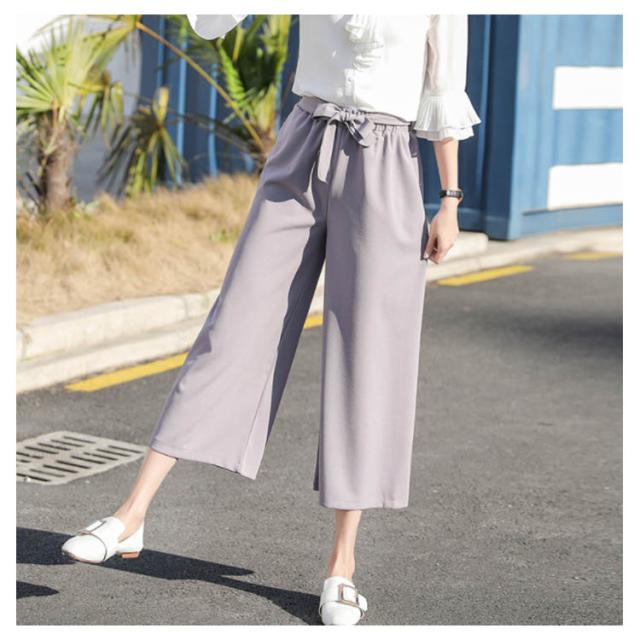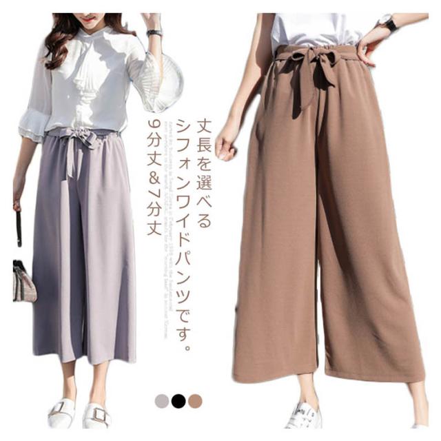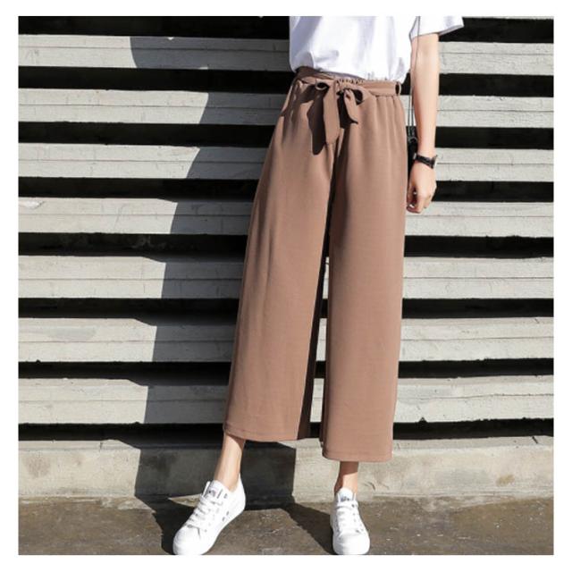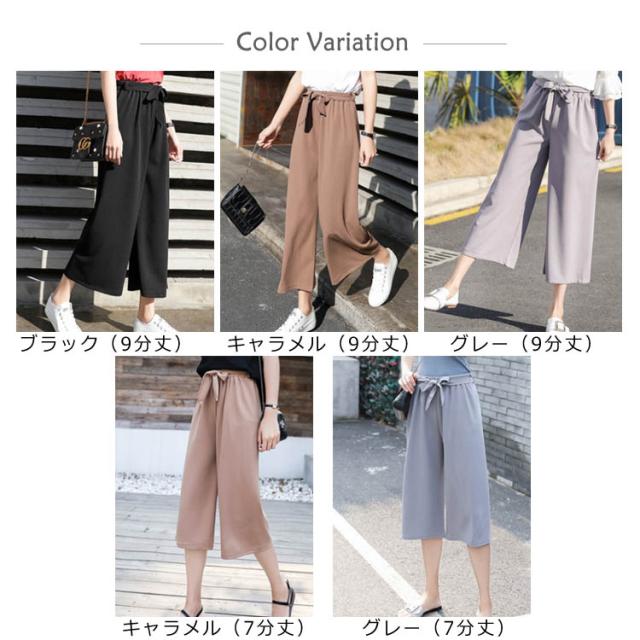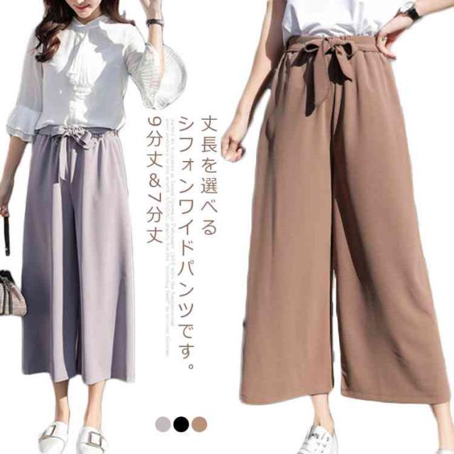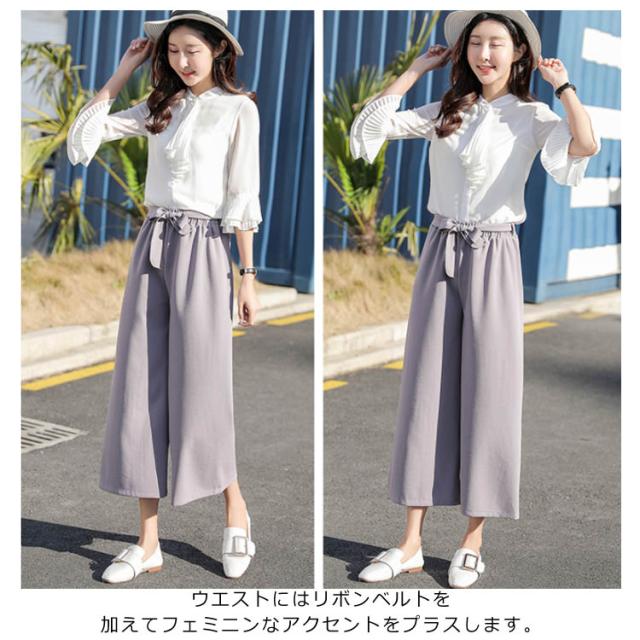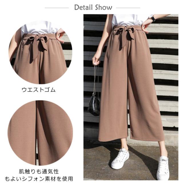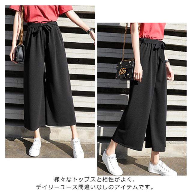 美脚 美尻 パンツ ワイドパンツ ガウチョパンツ レディース 春夏 ハイウエスト リボン ウエストゴム 無地 体型カバー 七分丈 九分丈 ゆったり