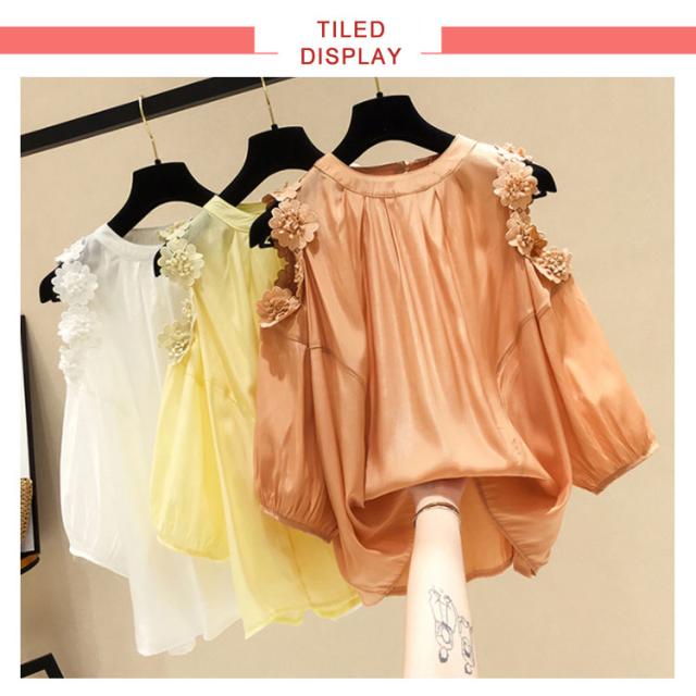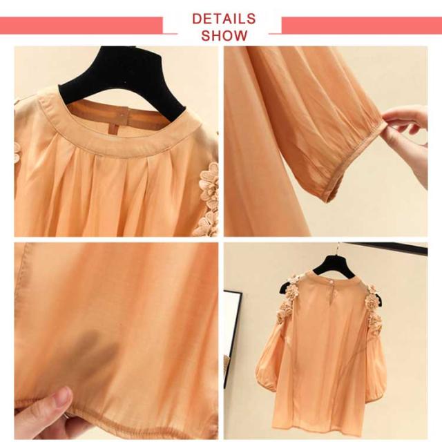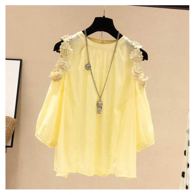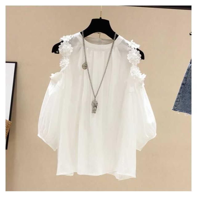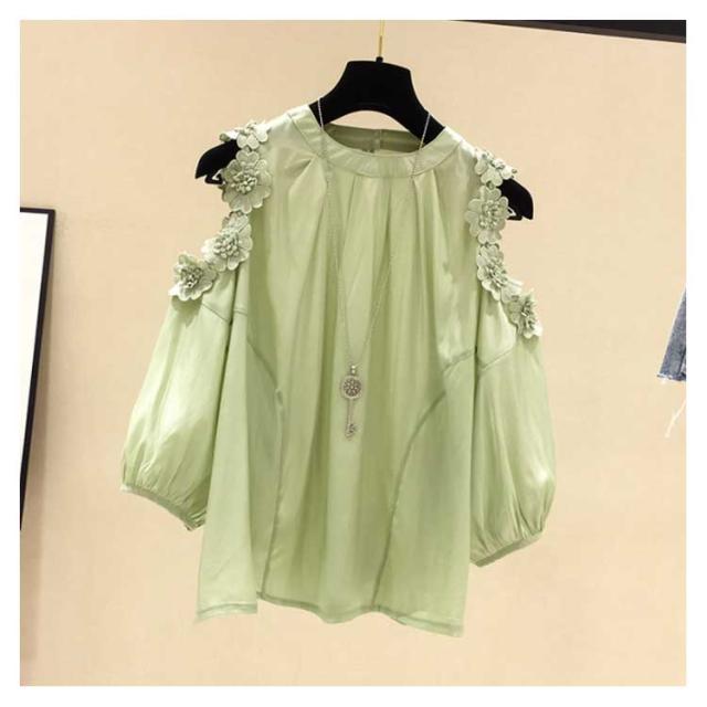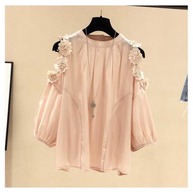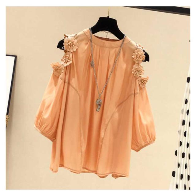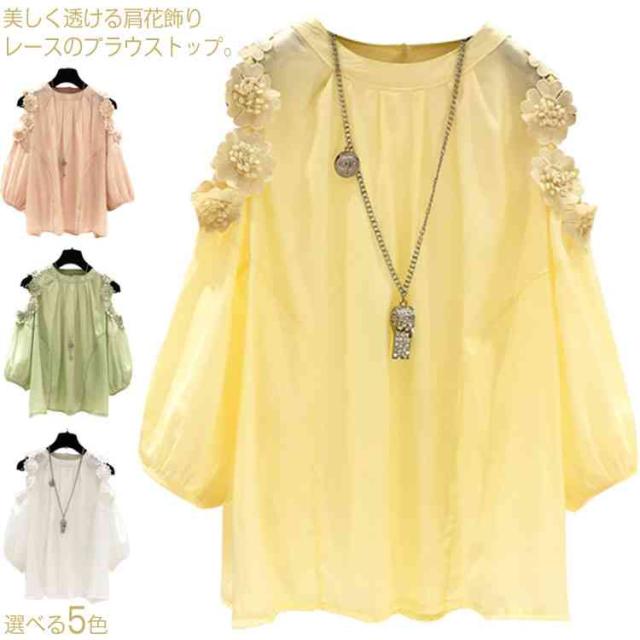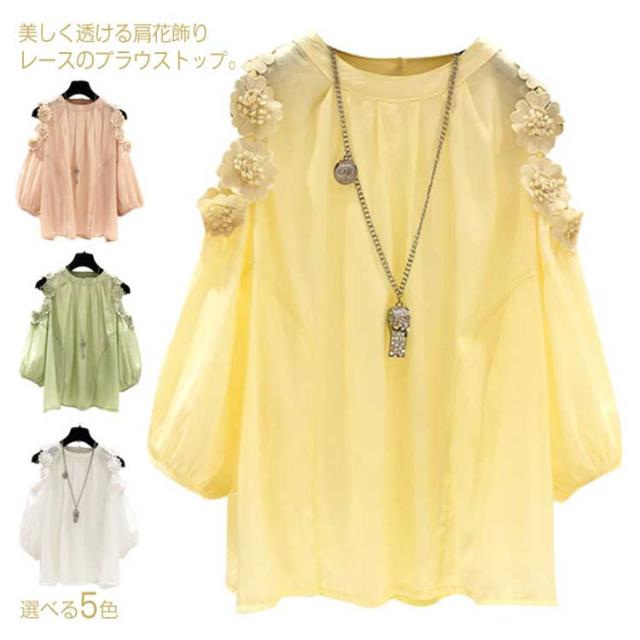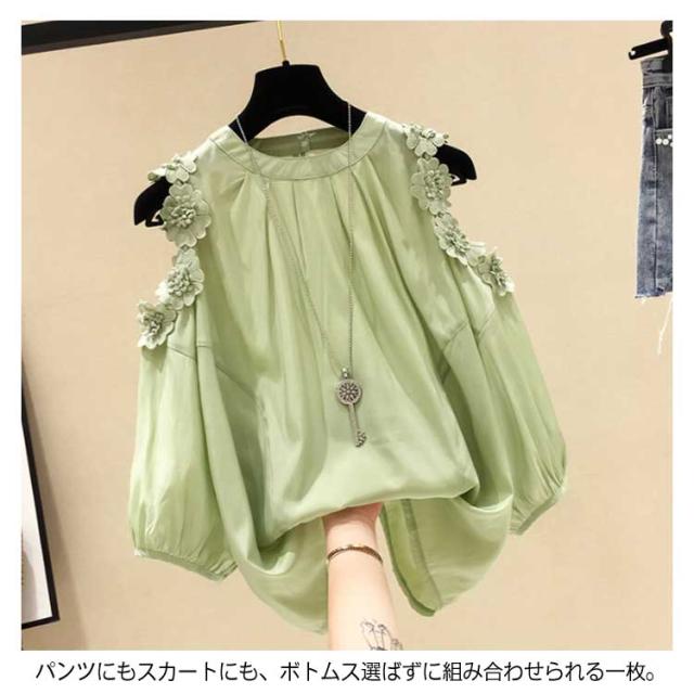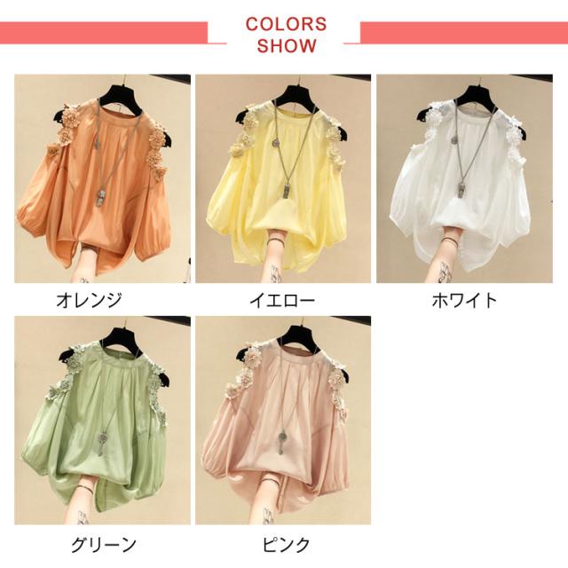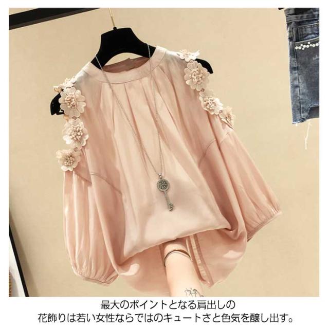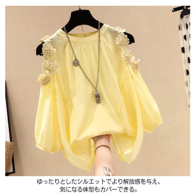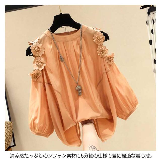 シャツ レディース シフォンシャツ 5分袖 トップス 無地 シフォン ブラウス バルーン袖 肩出し 大人可愛い 着痩せ シンプル 花飾り 新作送料無料