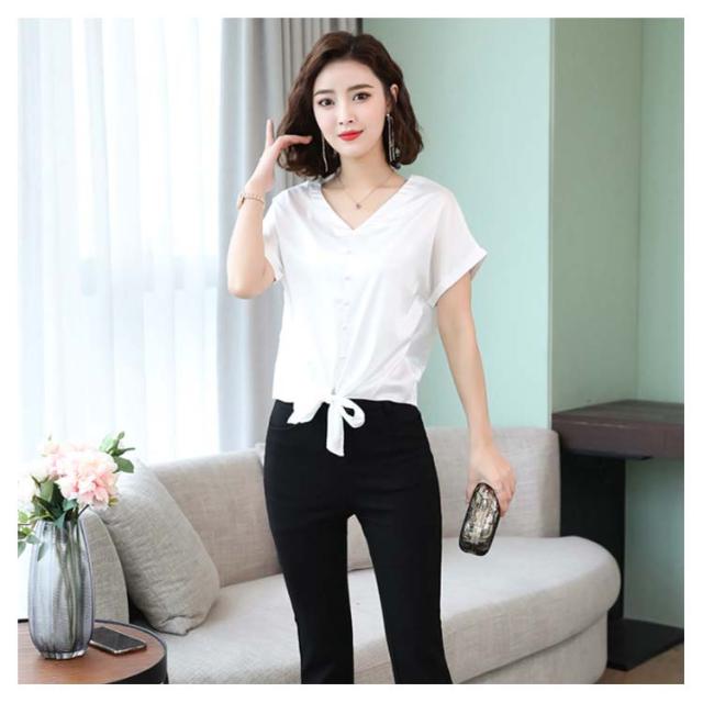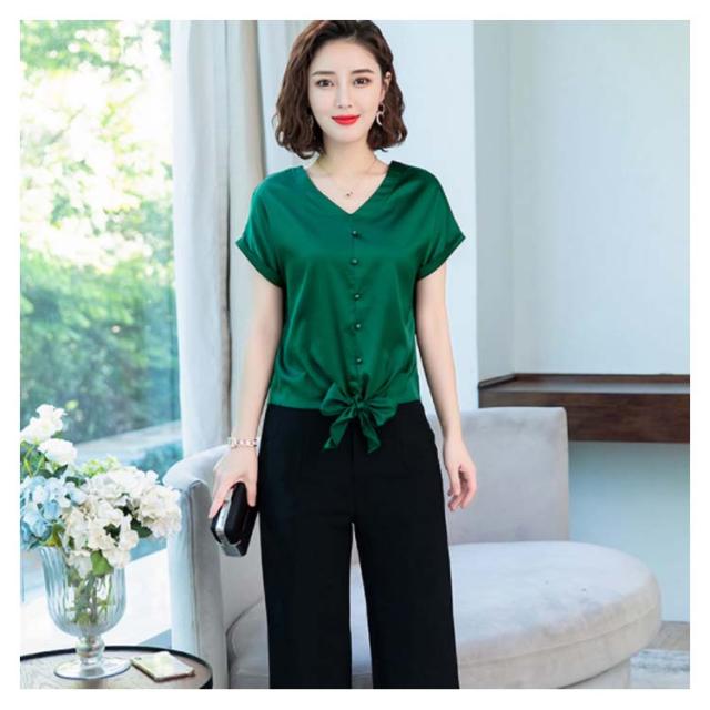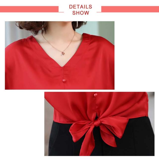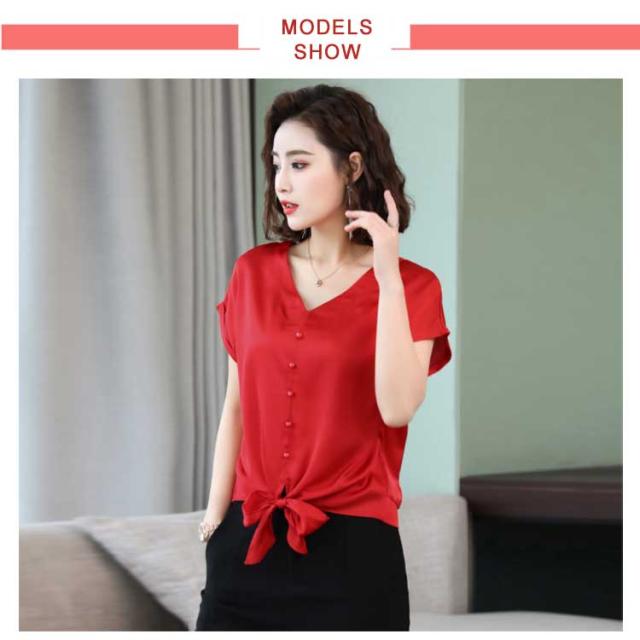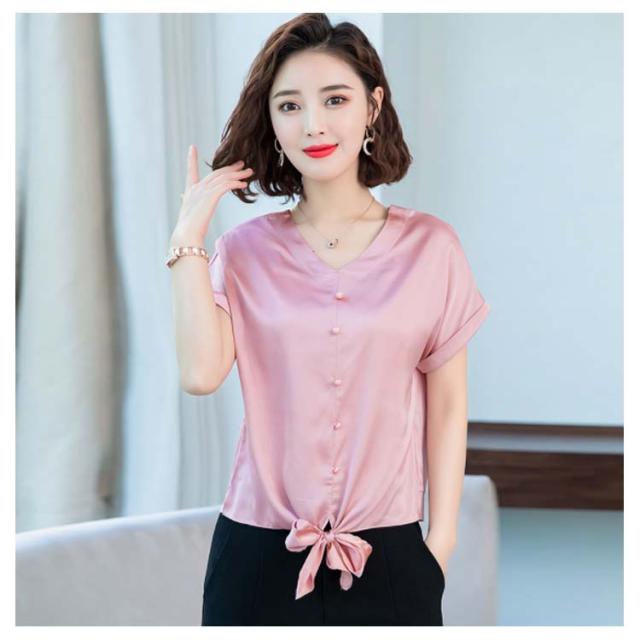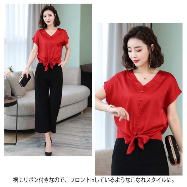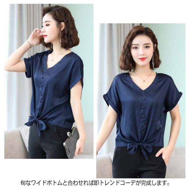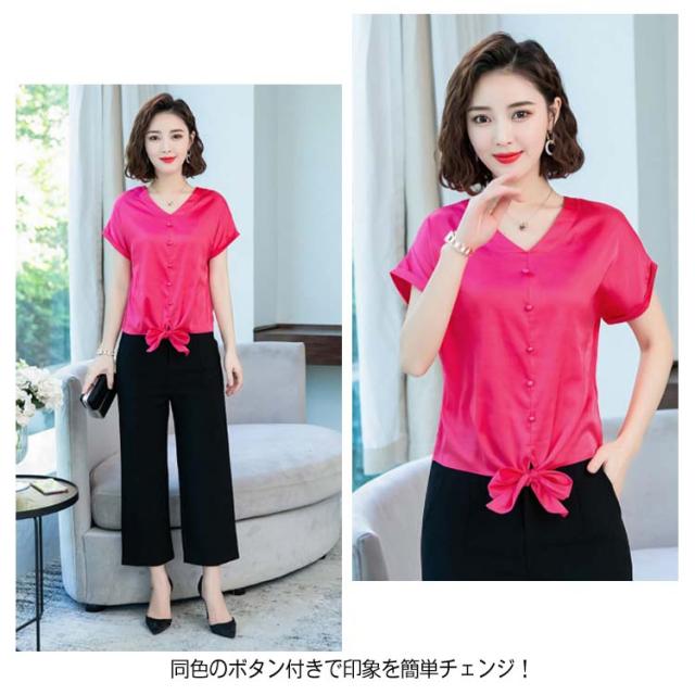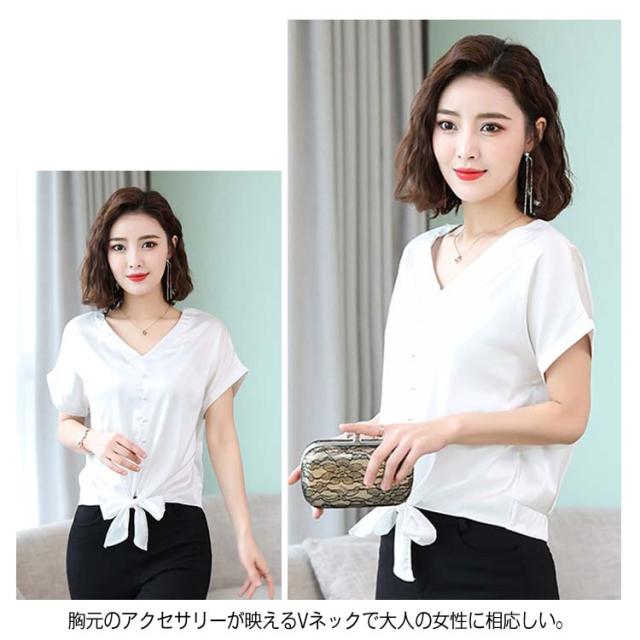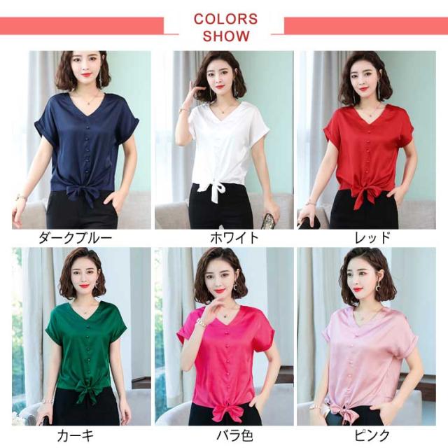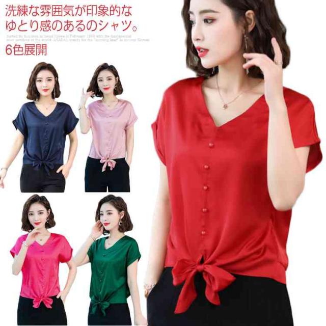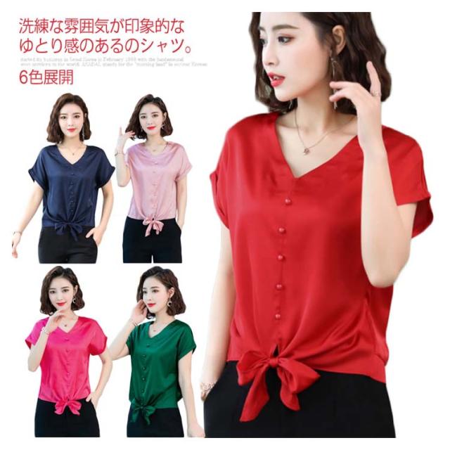 6色展開 シャツ トップス シルクタッチ 半袖 ブラウス レディース Vネック エレガント 大人女子 オフィス 通勤 ビジネス ゆったり 無地 サテン調 20代 30代 40代 50代送料無料