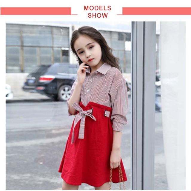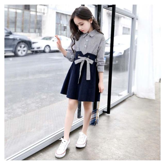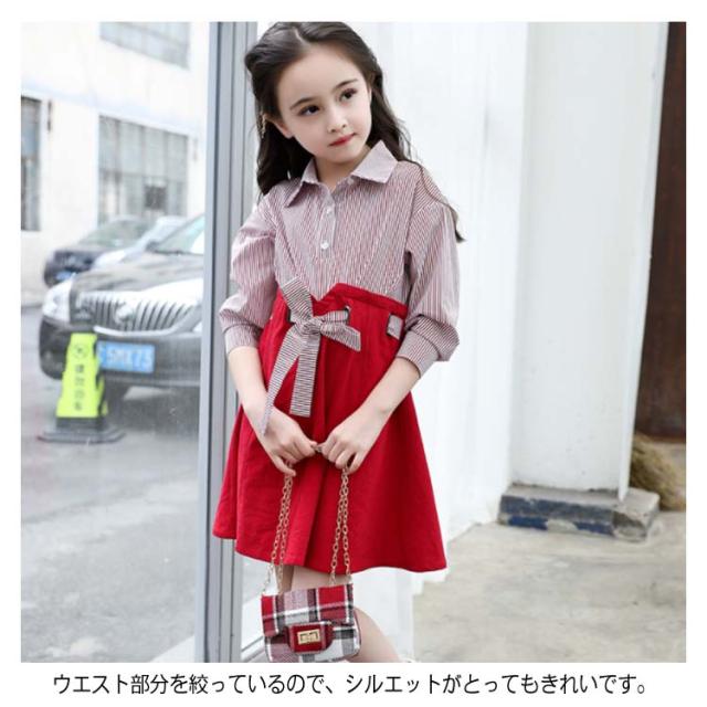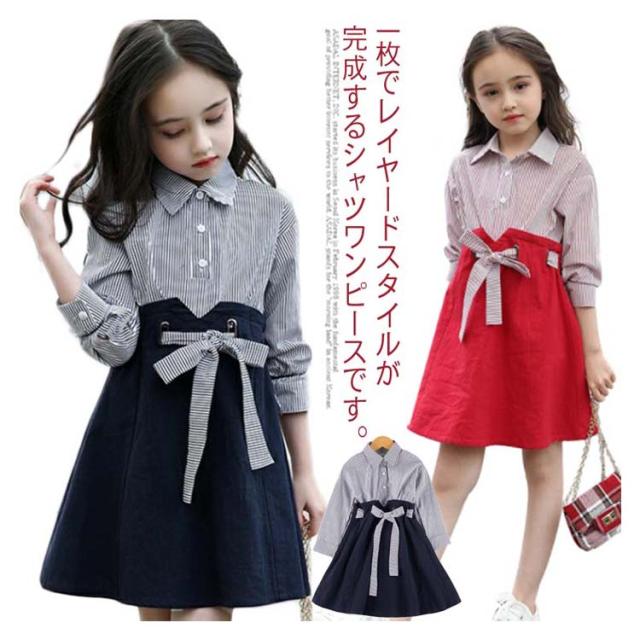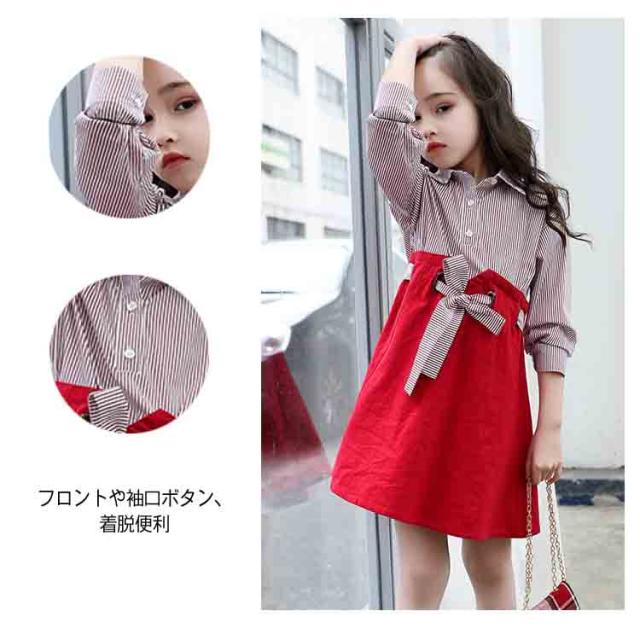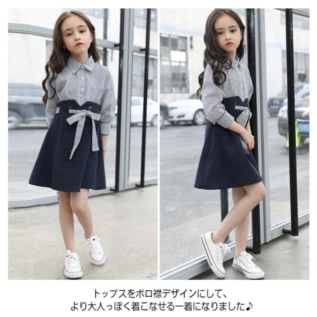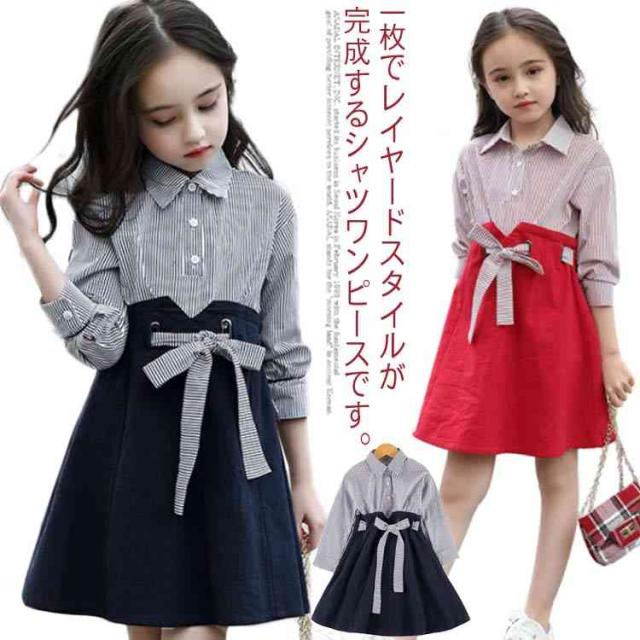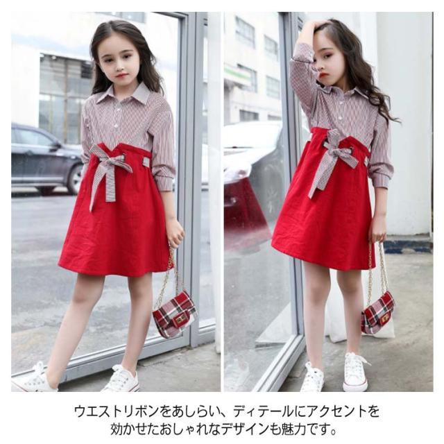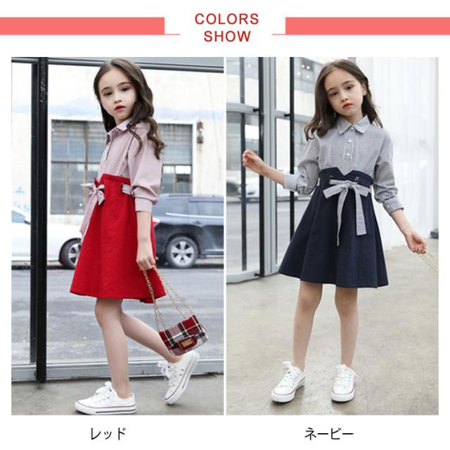 キッズワンピース おしゃれ ドッキングワンピース 韓国服 ワンピース 女の子 シャツワンピース 長袖 リボン 110 120 130 140 150 160送料無料