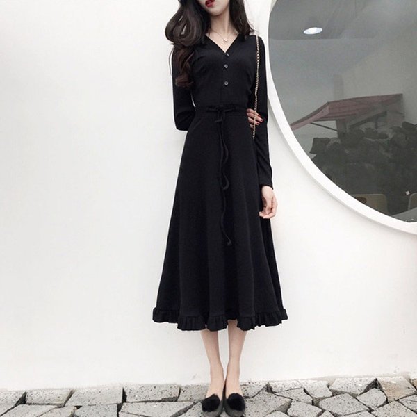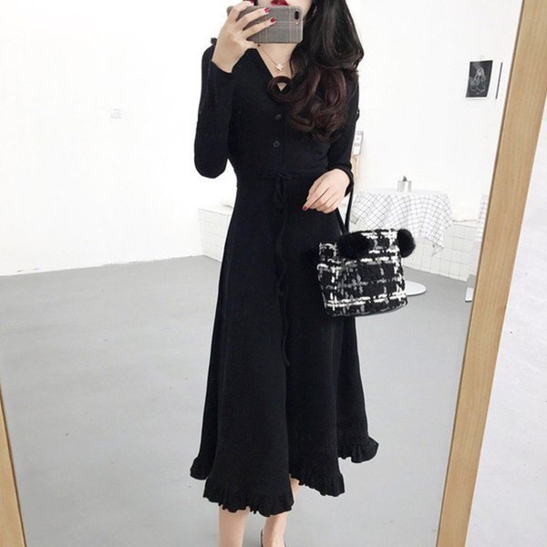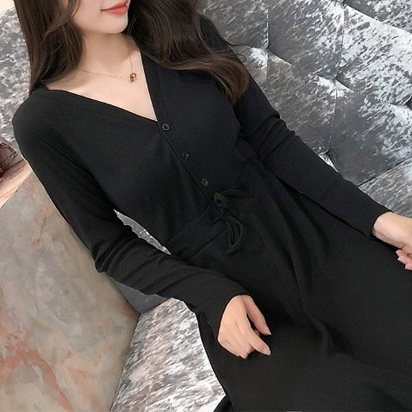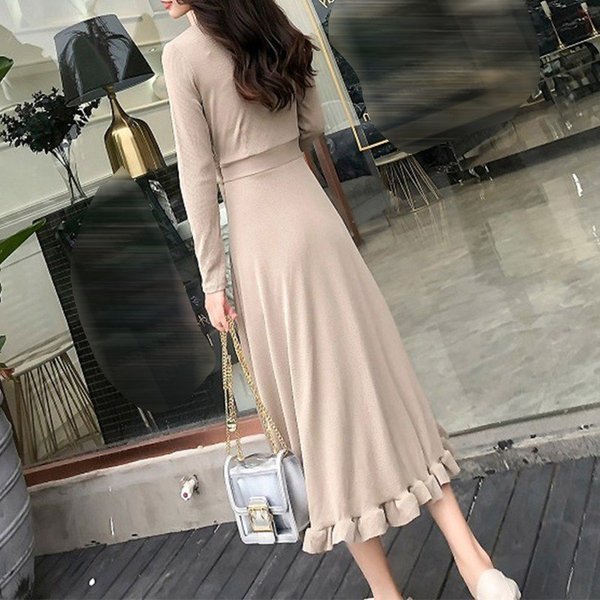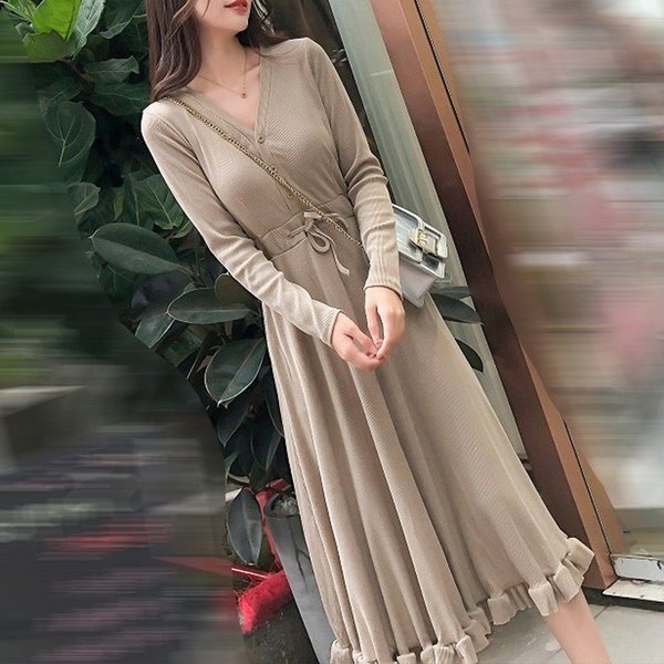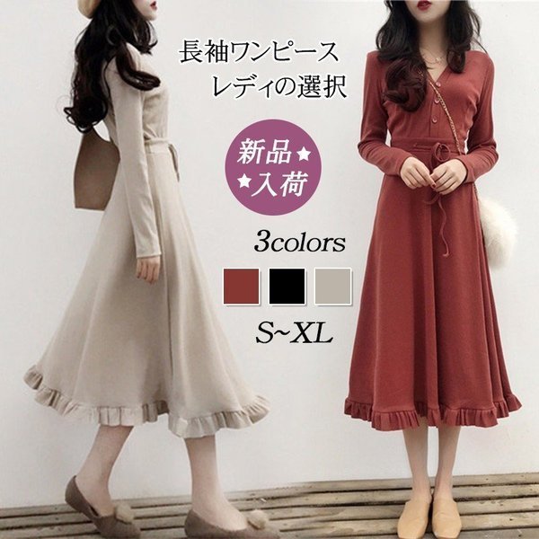 ワンピース レディース マキシ丈ワンピース 長袖 Vネック ニット 春秋 ロング丈 ドレス 無地 膝丈 フレア Aライン