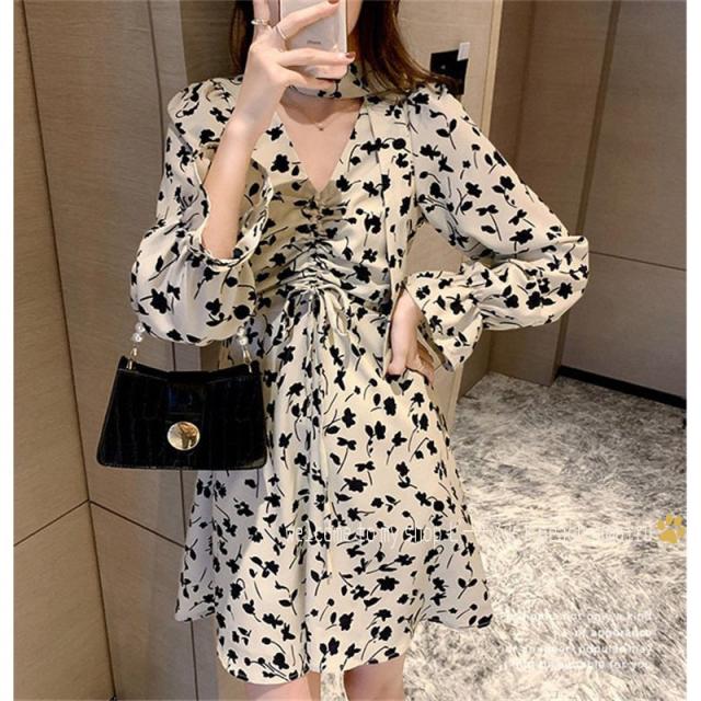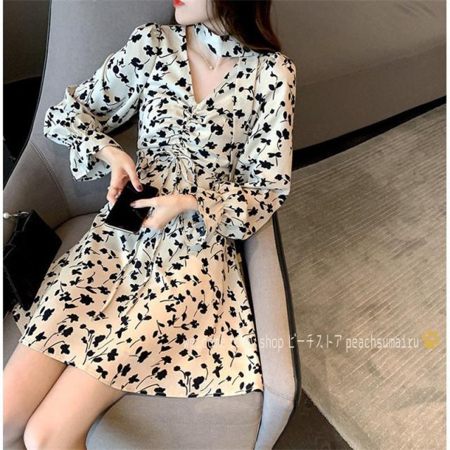 ワンピース レディース 40代 20代 きれいめ 春服 長袖 花柄ワンピース シフォンワンピース Vネック リボン ドレス 大きいサイズ おしゃれ 着痩せ 上品 通勤 新品