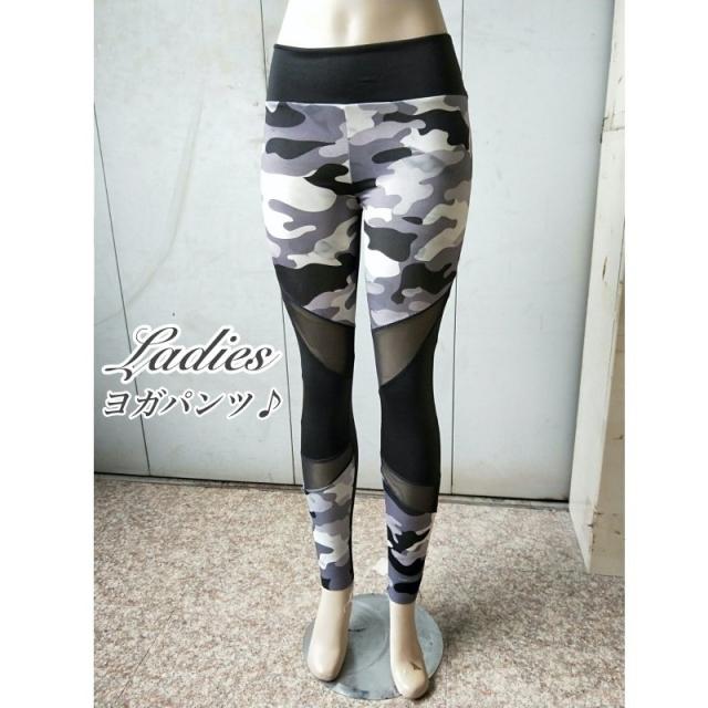 ヨガパンツ フィットネスパンツ レギンス スパッツ レディース 女性 ボトムス スポーツウェア ロング丈 ストレッチ メッシュ 透け感 迷彩柄 カモフ