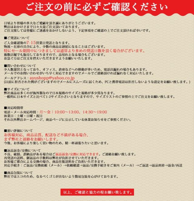| ●サイズ詳細等の測り方はスタッフ間で統一、徹底はしておりますが、実寸は商品によって若干の誤差(1cm〜3cm )がある場合がございますので、予めご了承ください。 ●製造ロットにより、細部形状の違いや、同色でも色味に多少の誤差が生じます。 ●パッケージは改良のため予告なく仕様を変更する場合があります。 ▼商品の色は、撮影時の光や、お客様のモニターの色具合などにより、実際の商品と異なる場合がございます。あらかじめ、ご了承ください。 ▼生地の特性上、やや匂いが強く感じられるものもございます。数日のご使用や陰干しなどで気になる匂いはほとんど感じられなくなります。 ▼同じ商品でも生産時期により形やサイズ、カラーに多少の誤差が生じる場合もございます。 ▼他店舗でも在庫を共有して販売をしている為、受注後欠品となる場合もございます。予め、ご了承お願い申し上げます。 ▼出荷前に全て検品を行っておりますが、万が一商品に不具合があった場合は、お問い合わせフォームまたはメールよりご連絡頂けます様お願い申し上げます。速やかに対応致しますのでご安心ください。 | |