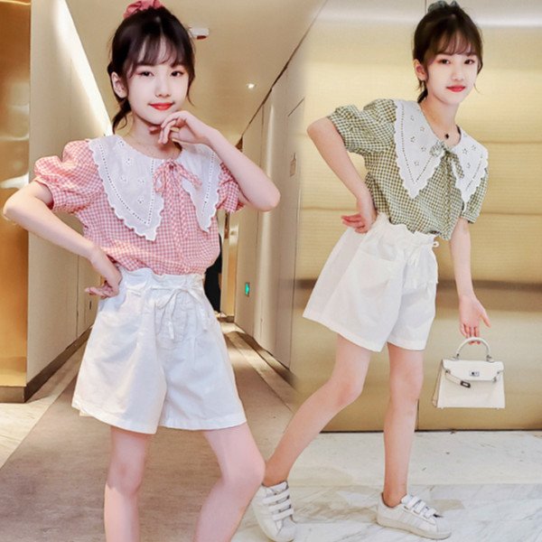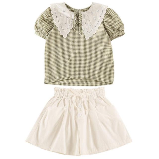 韓国子供服 セットアップ 夏服 新作 2点セット シャツ + ショートパンツ キッズ 女の子 上下セット チェック柄 半袖 シャツ スウィート リゾート 姉妹 通学 通園