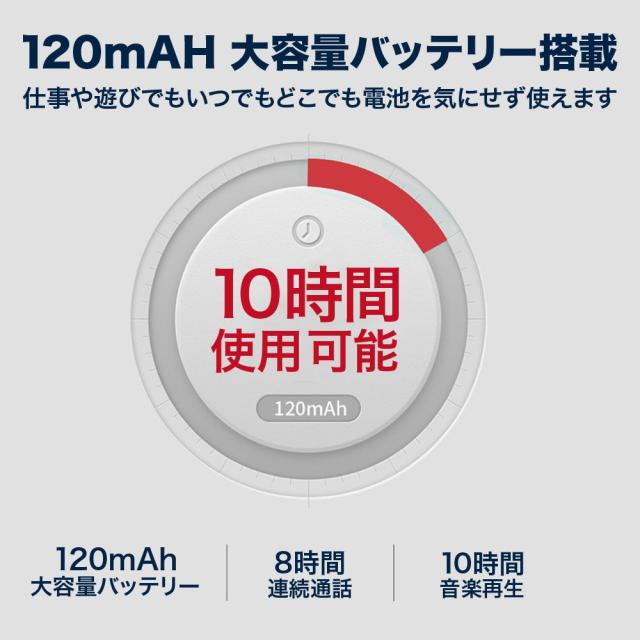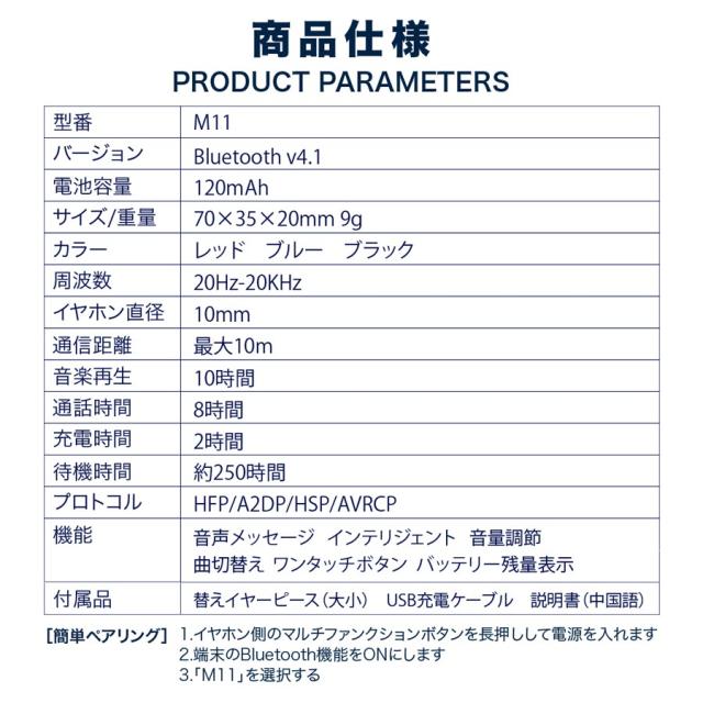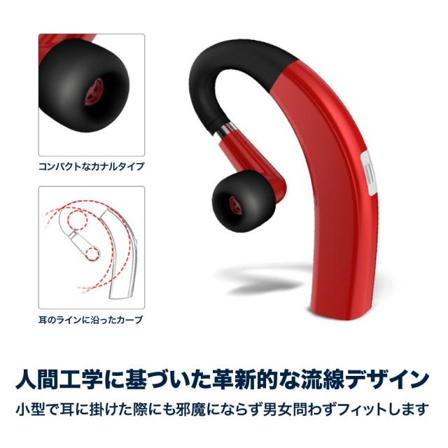 | サイズについての説明 | 製品説明 両耳対応。耳掛け型ブルートゥースワイヤレスイヤホン。Bluetooth 4.1 耳のラインに基づいた設計によって、右耳、左耳にて快適な装着感でご利用頂けます。 軽量で長時間装着していても、耳の痛みなど負担をかけることなくご利用頂けます。 防水なので、スポーツの際の汗など水にぬれても安心です。 本体端末に本製品の残り時間が表示されます。 270°回転が可能で、右左の耳に装着可能です。 お好みの角度に合わせてご利用できます。 容量:120mah 最大利用時間:10時間 連続利用時間:8時間 重量:9g |