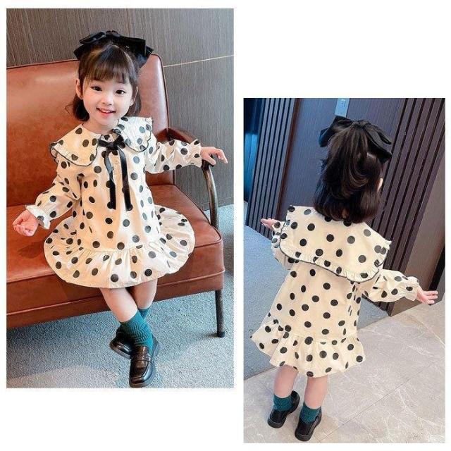子供服 ワンピース 春 秋 ドット柄 女の子 幼児 ワンピ ワンピー 長袖 ラペル 水玉柄 可愛い キッズ ベビー 結婚式 ページュ コーデ デイリー 切り替え 80-130