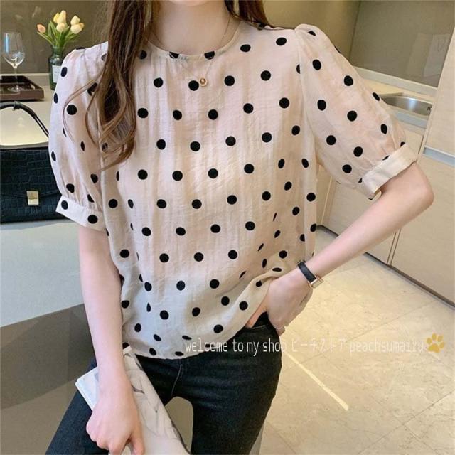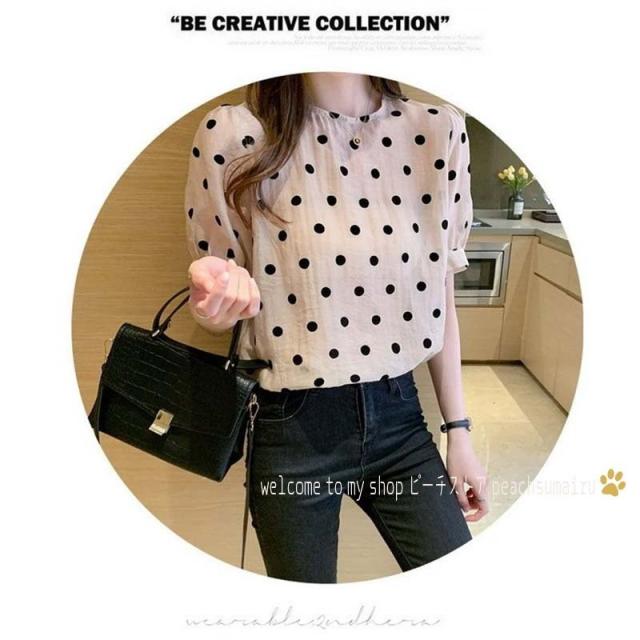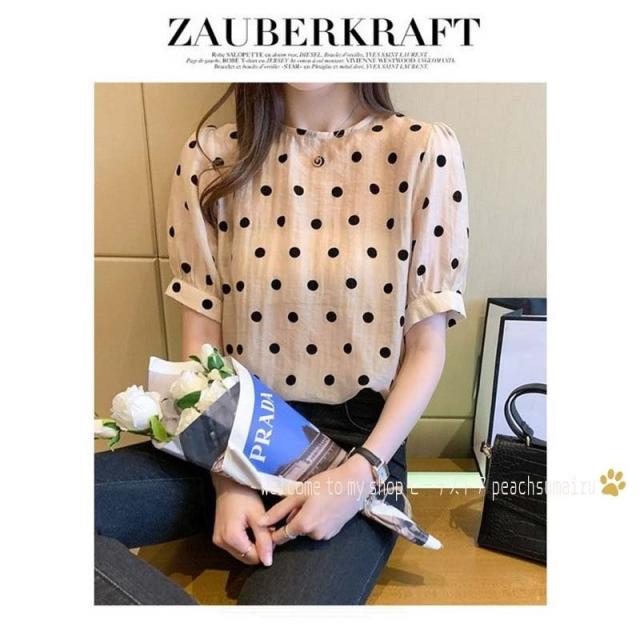 ブラウス レディース 40代 春夏 オシャレブラウス シフォン 可愛いドット柄ブラウス パフスリーブ 半袖トップス おしゃれ 大人 通勤 ゆったりTシャツ 30代50代