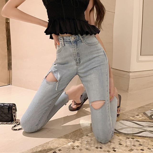 ダメージ加工 デニムパンツ レディース スキニー タイト ジーンズ 長ズボン ハイウエスト レギンス ロングパンツ ボトムス 美脚 カジュアル ジーパン 着痩せ