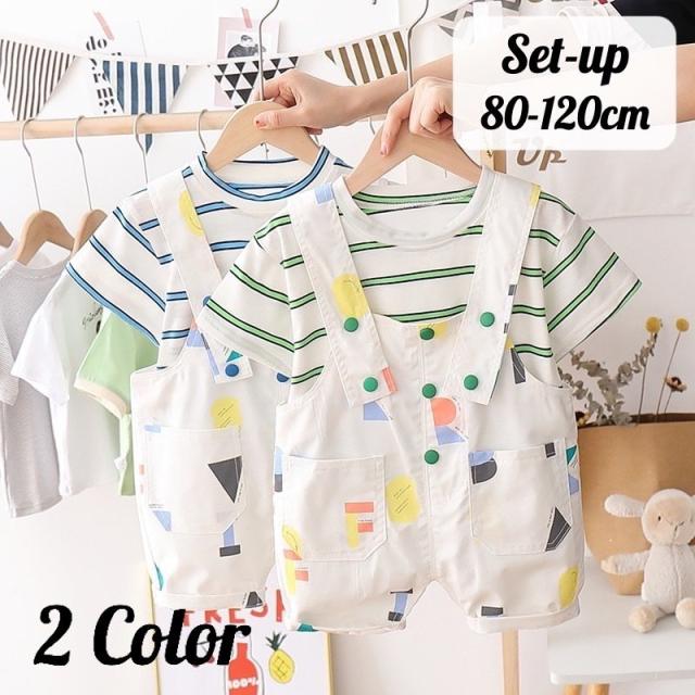 セットアップ 2点セット Tシャツ サロペットパンツ キッズ 女の子 男の子 半袖 ボーダー柄 半ズボン オーバーオール かわいい お出かけ 入園式