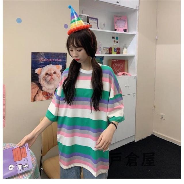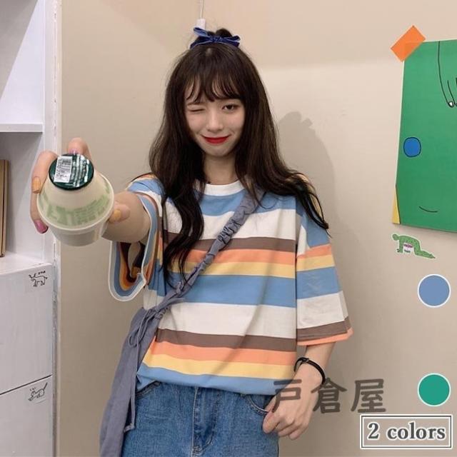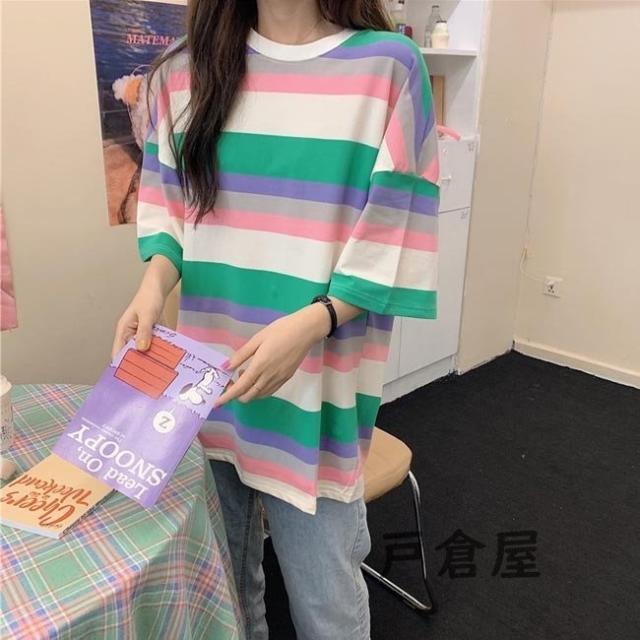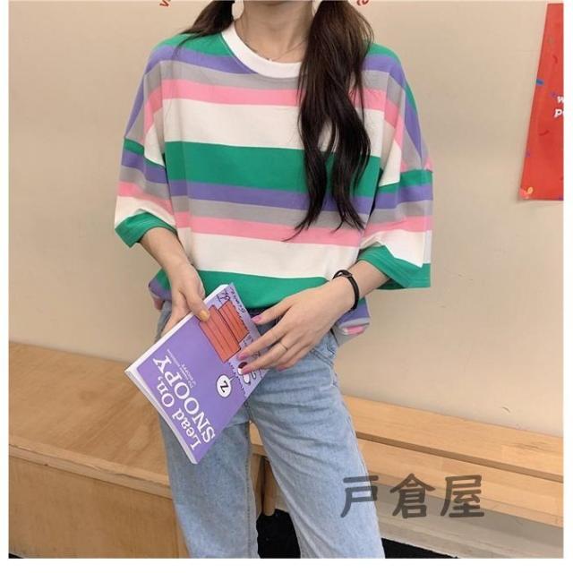 Tシャツ 半袖 ボーダー柄 レディース 半袖Tシャツ オーバーサイズ カットソー ゆったり ラウンドネック ボーダー柄Tシャツ 夏Tシャツ 2021