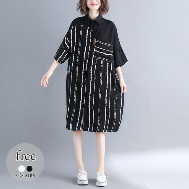 ワンピース シャツワンピース ストライプ柄 襟付き 膝丈 ポケット ボタン ナチュラルコーデ ふんわり 休日 学校行事 リモート 食事会 /[ogx31]