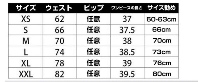 | サイズについての説明 | 【サイズ】(約): XS → ウェスト:62cm ヒップ:任意 ワンピースの長さ:37cm S → ウェスト:66cm ヒップ:任意 ワンピースの長さ:37.5cm M → ウェスト:70cm ヒップ:任意 ワンピースの長さ:38cm L → ウェスト:74cm ヒップ:任意 ワンピースの長さ:38.5cm XL → ウェスト:78cm ヒップ:任意 ワンピースの長さ:39cm 2XL → ウェスト:82cm ヒップ:任意 ワンピースの長さ:39.5cm 【ご注意】 ■メジャー採寸ですので多少の誤差が生じる場合がございます、予めご了承下さい。 ■商品はデジカメ撮影をしておりますので、お使いのPC環境等により、画像の色が実物と多少異なる場合がございますが、 ご予めご了承下さいませ。 |