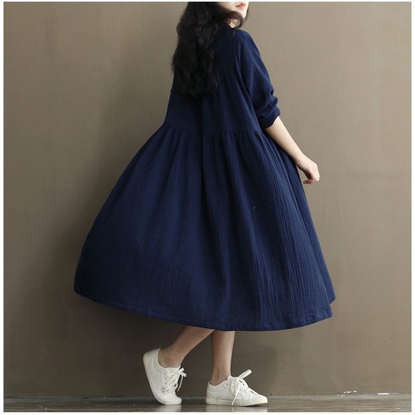 マキシワンピース レディース 無地 綿 麻 5分袖 マキシ丈 森ガール 夏 ドレス 大きめチェック柄 体型カバー ゆったり ポイント消化
