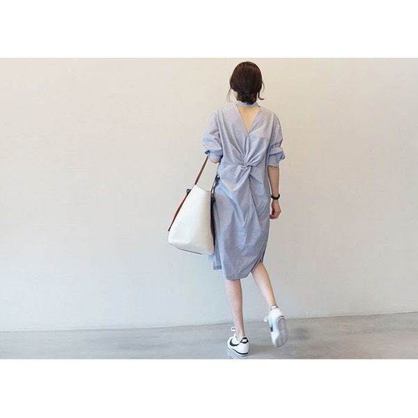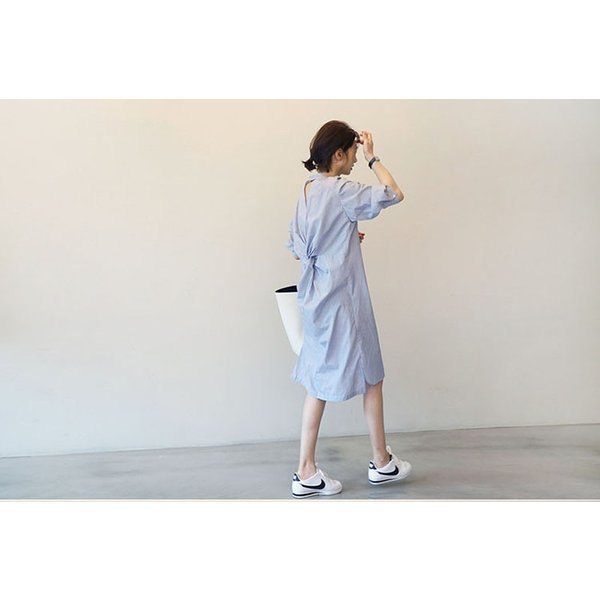 ワンピース レディース 春夏 膝丈ワンピース きれいめ ボーダー 七分袖 背中あき ロング 韓国風 通勤 OL 着痩せ オシャレ 上品 ポイント消化