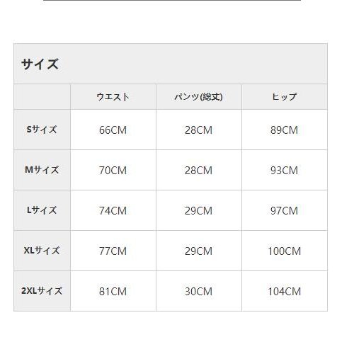 | サイズについての説明 | 【サイズ】 Sサイズ ウエスト66CM パンツ(総丈)28CM ヒップ89CM Mサイズ ウエスト70CM パンツ(総丈)28CM ヒップ93CM Lサイズ ウエスト74CM パンツ(総丈)29CM ヒップ97CM XLサイズ ウエスト77CM パンツ(総丈)29CM ヒップ100CM 2XLサイズ ウエスト81CM パンツ(総丈)30CM ヒップ104CM 【ご注意】: ※上記表記は当店平置き実寸サイズになります。 ※大量生産による生産過程におきまして、若干の個体差が生じる場合がございます。 |